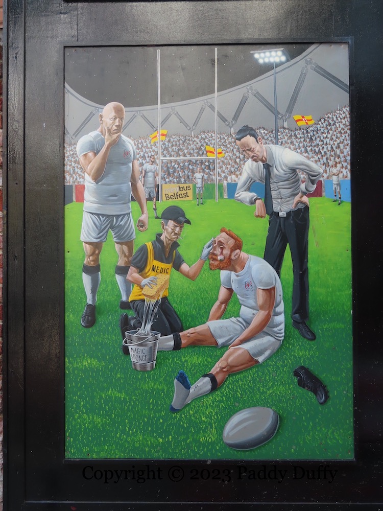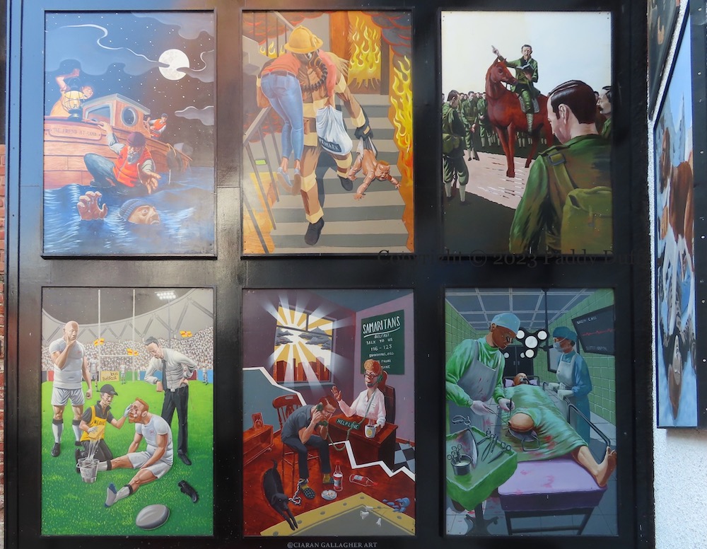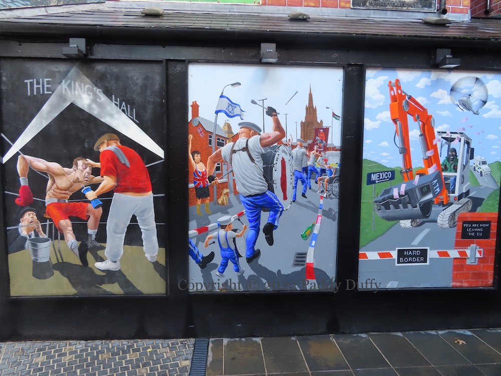 The other panels in the group of three show a boxer being attended to in his corner at the King’s Hall and a masked man leaving the EU and heading for Mexico off with an ATM in the bucket of an excavator.