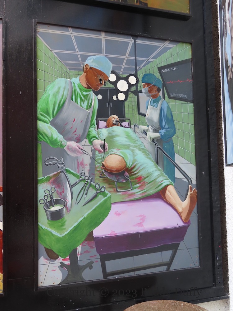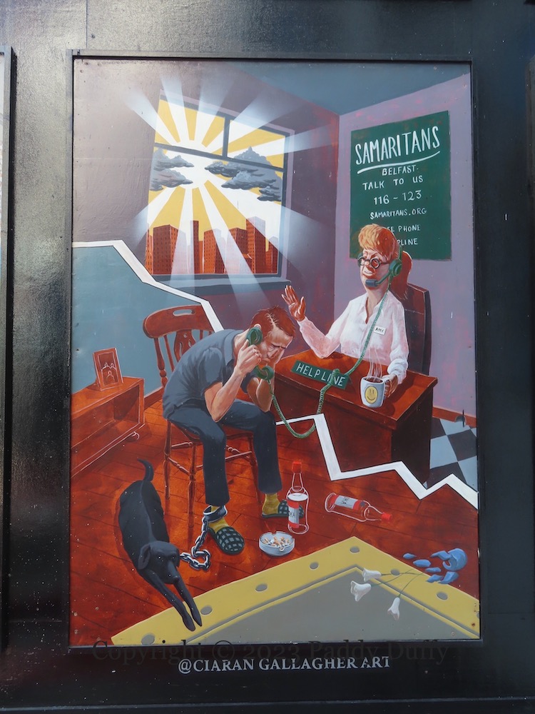 Easter marks the unofficial start of the PUL marching season, with many marches today by various Apprentice Boys bands. The season runs until the end of August, with a high point around July 12th (Parades Commission | CAIN calendar). The painting above (by Ciaran Gallagher (ig) in the Dark Horse courtyard for a nine-part series called The Friend At Hand) packs in many familiar tropes: King Billy on a banner, kerb-stones painted red-white-and-blue, the Israeli flag flying from a lamp-post, and a bottle of Buckfast lying in the gutter. Decorating the skin, however, is rare, and the use of Irish – “an cara ıdır lamha [lámha]” [“in aıce láımhe” or “ag an láımh”] – on a Lambeg drum is unknown.