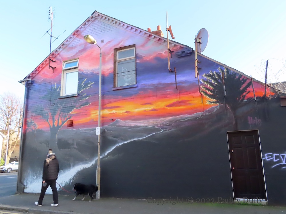 The Ballyhackamore mural by Ed Hicks (ig) – painted along with murals by emic and Alana McDowell – is on the eastern side of Eastleigh Crescent, so that when looking at it the viewer is looking away from the city and towards the … hills – perhaps Scrabo country park.