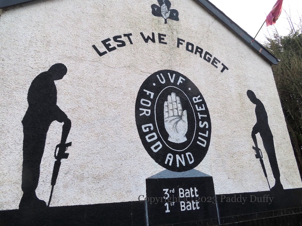 Lest We Forget 2023-01-152024-08-28Extramural Activity East Antrim 1st battalion (specifically D Company?) and (North?) Belfast 3rd battalion mural in Erskine Park, Ballyclare. Click image to enlargeCopyright © 2023 Paddy DuffyT01824 Share this: Click to share on X (Opens in new window) X Click to share on Facebook (Opens in new window) Facebook Like Loading... Related