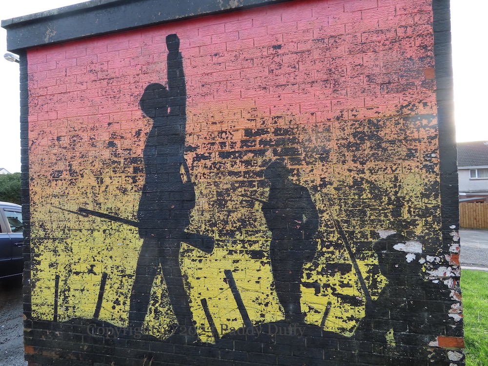 This is a UVF/YCV mural in Grange Drive, Ballyclare, celebrating and commemorating soldiers from the Ulster Volunteers who went on to serve in the 36th (Ulster) Division in WWI and in particular at the Somme. The central panel shows soldiers bearing the Division’s standard (painted in colour in an otherwise black-and-white mural and in the style of the (US) Marines ‘Iwo Jima’ Memorial (WP)) which comprises the Union flag, harp insignia of the Royal Irish Rifles, and the red hand of Ulster on a field of shamrocks.