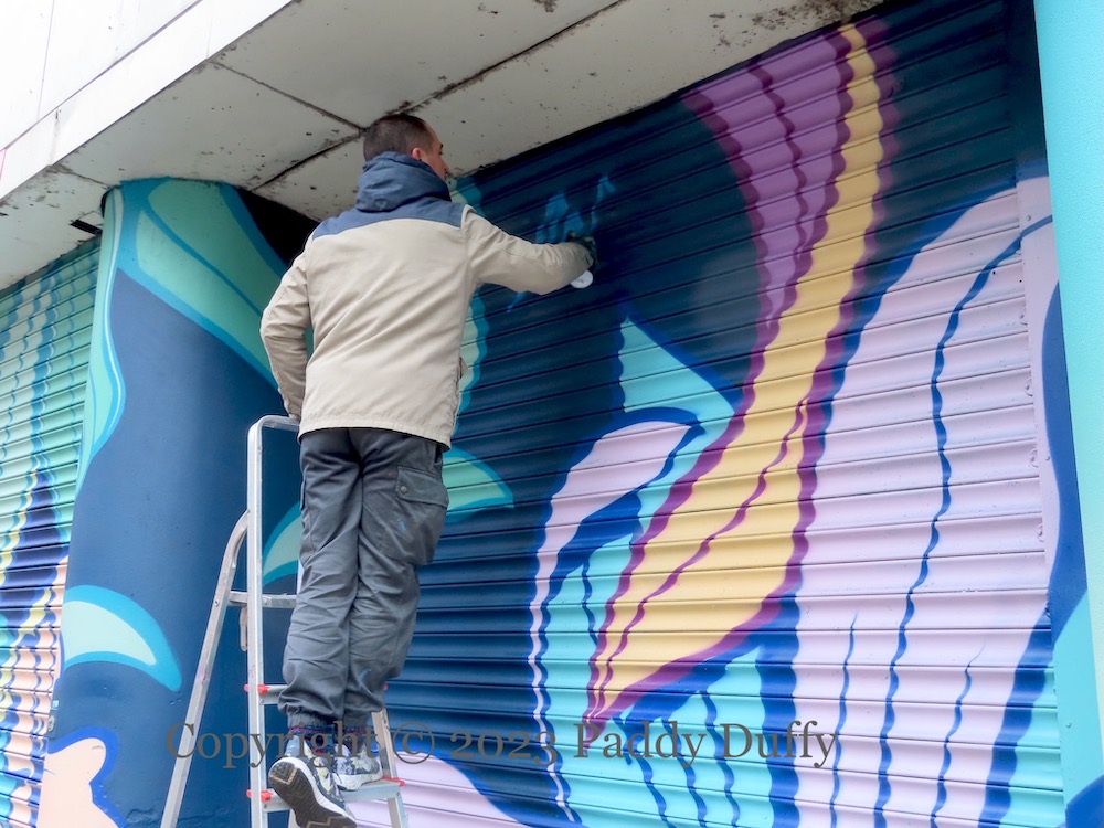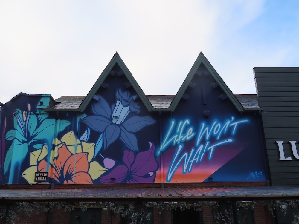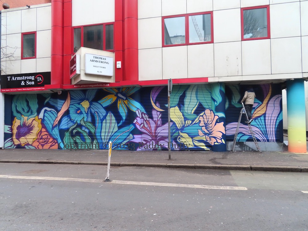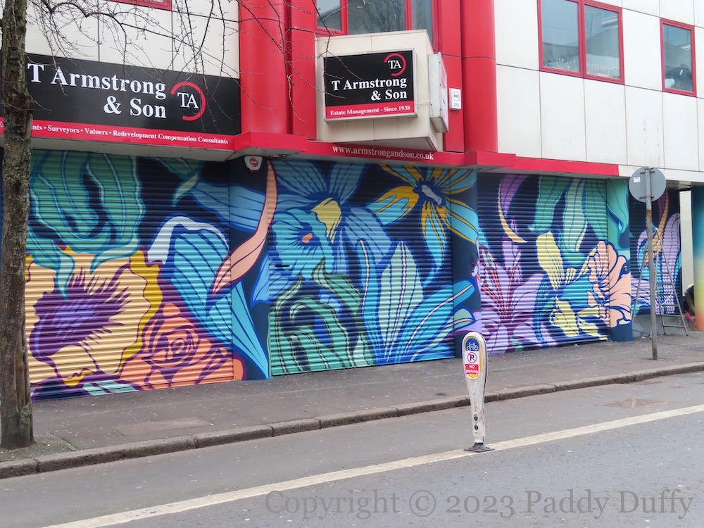 Here are both the new and the old pieces from French artist (now based in London) Nerone (ig | web). The new piece is a wide arrangement of flowers in Upper Arthur Street. The older piece (shown in the final image, below) is from 2021’s Hit The North, “Life Won’t Wait” above the night-club (currently Club Lux) in Dunbar Road.