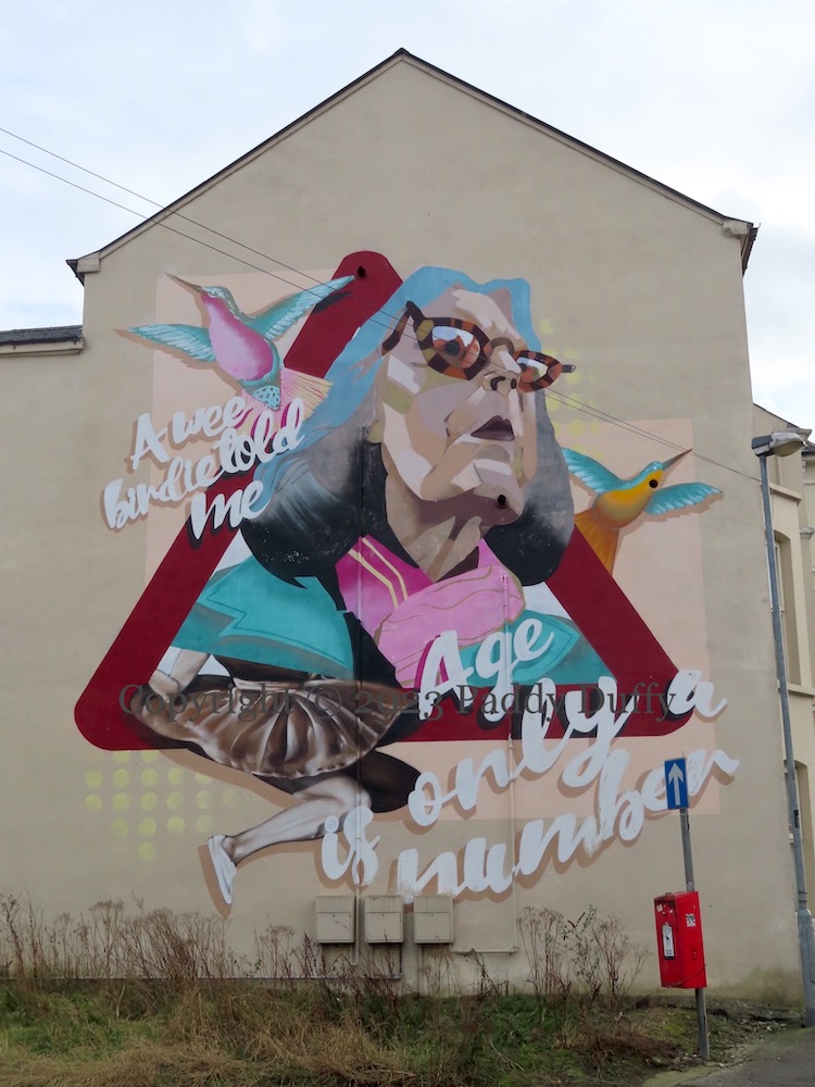 “A wee bird told me … age is only a number.” This mural wasa painted by UV Arts in Distillery Close, Londonderry, across the street from – and based on the memories of residents of – Malvern House, the Older People North West’s Centre (Fb) (Derry Now).