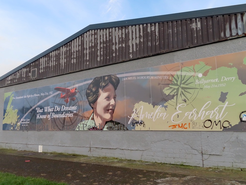 “Everyone has oceans to fly, if they have the heart to do it. Is it reckless? Maybe. But what do dreams know of boundaries?” When she left Harbour Grace, Newfoundland, on the evening of May 20th, 1932, Amelia Earhart’s intended destination for the first solo trans-Atlantic flight by a woman was Paris, France, but after various mechanical difficulties she landed instead in Ballyarnett, just outside Derry. For the 90th anniversary of her history-making flight, the artwork above was created by Joe Campbell (web), commissioned “by Community Restorative Justice in partnership with Derry & Strabane Distict Council’s Good Relations Programme and with the assistance of Greater Shantallow Community Arts.”