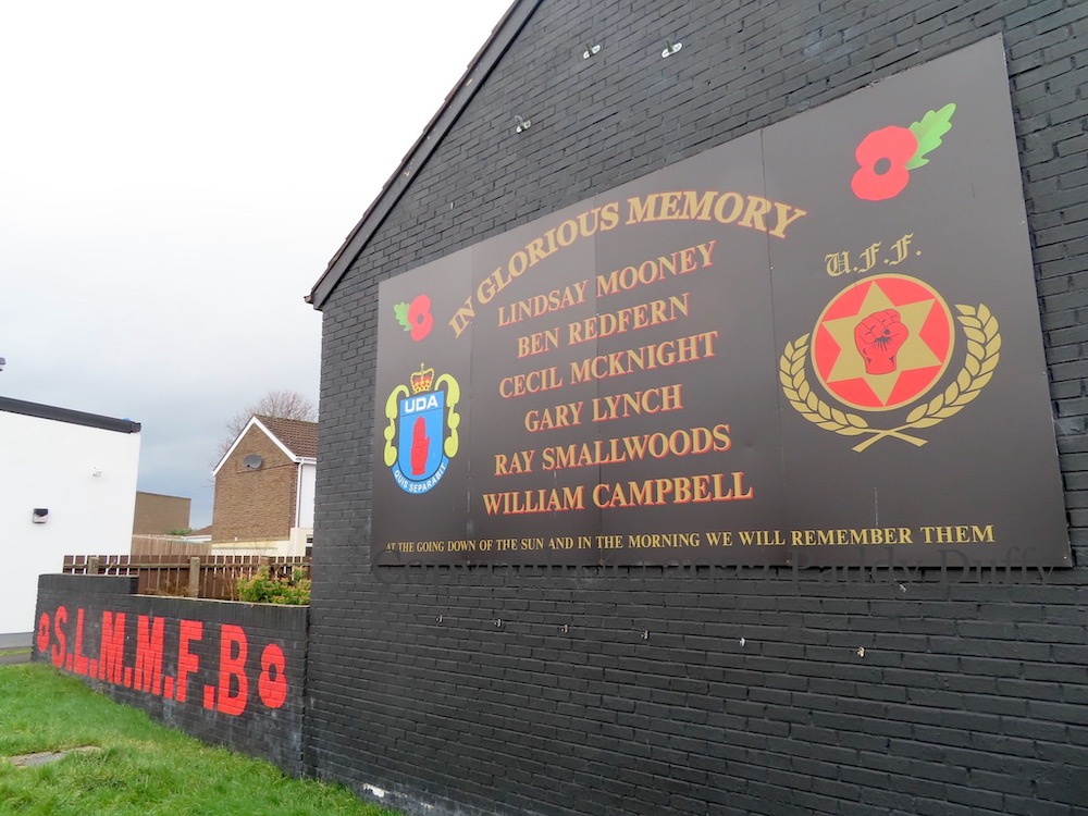 “S.L.M.M.F.B.” [Sergeant Lindsay Mooney Memorial flute band] “In glorious memory: Lindsay Mooney, Ben Redfern, Cecil McKnight, Gary Lynch, Ray Smallwoods, William Campbell. ‘At the going down of the sun and in the morning we will remember them.'”