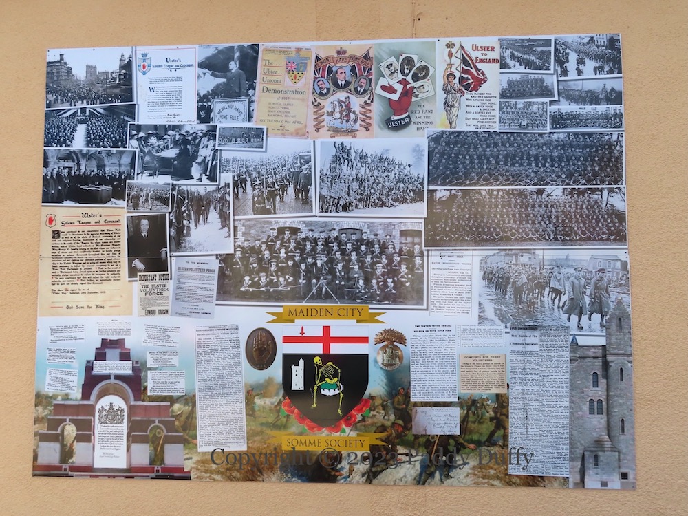 This board from the Maiden City Somme Society (Fb) traces the history of 1912-1918, from the protests against Home Rule and the signing of the Ulster Covenant (both the men’s (middle left) and women’s (top row, second from left) versions of the declaration are shown; also in the top row are postcards seen previously in The Red Hand And The Winning Hand and Ulster Girl), to the formation and training of the Ulster Volunteers (specifically the City of Derry regiment – emblem left of the city crest), to the Ulster Division’s service in WWI (specifically the 10th Battalion Royal Inniskilling Fusiliers or ‘Derry Volunteers’ – emblem right of the city crest) shown in the bottom row by JP Beadle’s painting (see Over The Top) flanked by the Thiepval and Ulster Tower memorials.