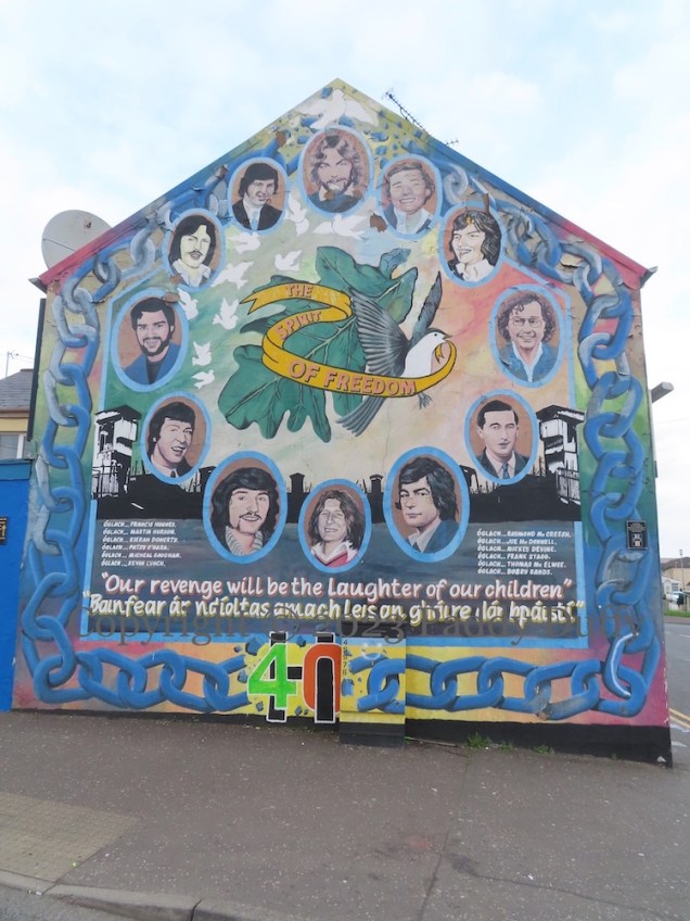 The plaque to the left reads, “This mural is dedicated to all those who tragically died on the streets of Derry during the hunger strike era. Suaımhneas Dé da nanamacha. 3rd October 2006.” The mural referred to is in fact the ‘crumbling cell’ mural (see M03350); the ‘Spirit Of Freedom’ mural was first painted in 2011 for the 30th anniversary (see X00999) – the 30th anniversary plaque remains, on the right of the mural but for the 40th anniversary of the 1981 hunger strike “40” replaced the “30” in the bottom border.