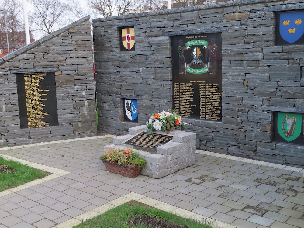“This monument is dedicated to the people of Derry City who have resisted & still resist the occupation of our country by Britain. We acknowledge with pride the sacrifices they made throughout every decade. Their names would be too numerous to mention & their deeds of bravery & resistance unequaled in the history of our struggle. The republican movement of Derry City salute you and your families. Your reward will only be a united Ireland.”