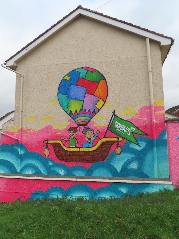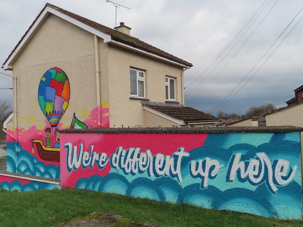 “Here” is Top Of The Hill, and “up here” refers to the elevated position of the community, 75 metres above the Foyle (topo map). You can get to TOTH by road or by sailing in a boat under a patchwork balloon. Art by Gorbals in Trench Road, Derry.