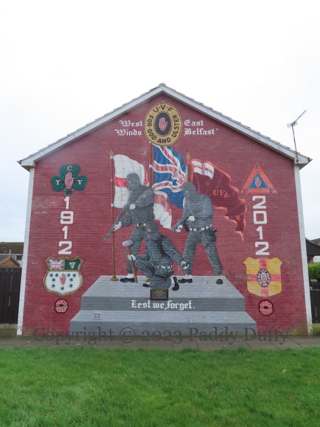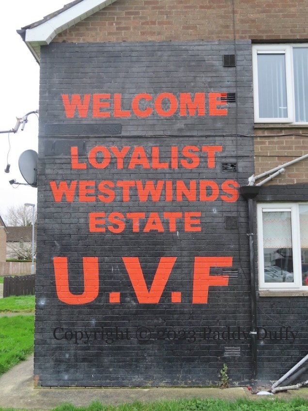 Here is a gallery of UVF stencils and boards in the Westwinds estate. Despite being in Newtownards, the UVF here is allied with the East Belfast brigade, rather than the North Down brigade – see Belfast Live for background.