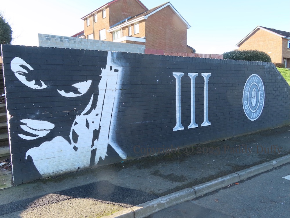 This hooded gunman from the UVF’s North Belfast/3rd battalion will keep an eye on your wains while they play in the playground across the street. This mural replaces a kids’ mural that read “New Mossley estate recognises the importance of its young people.” (Street View)