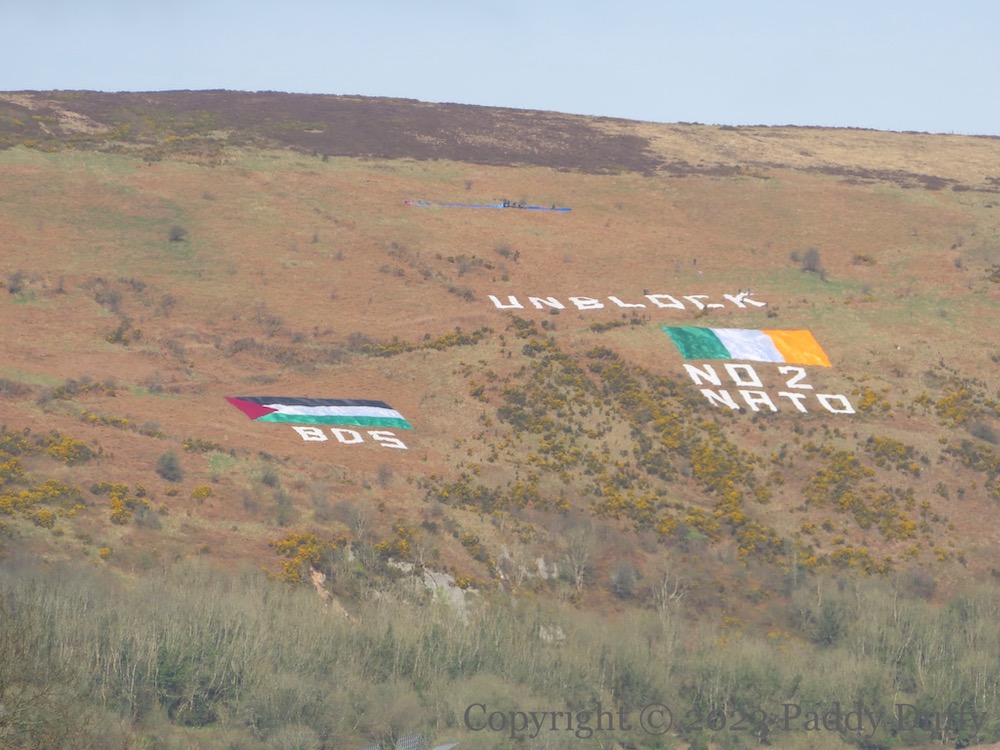 A trio of international causes aimed at the visiting Joe Biden, president of the United States, from Gael Force Art and People Before Profit. What’s new here is the “No 2 NATO” under the Irish Tricolour. The other two parts have been on the mountain previously: the Cuban flag with “unblock Cuba” reprises the maassive Cuban flag on the mountain in 2021, which was depicted in the La Solidaridad Invariable mural on Divis St, and the Palestinian flag with “BDS” [Boycott, Divestment, Sanctions] in 2018’s #BDS.