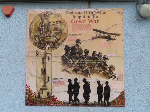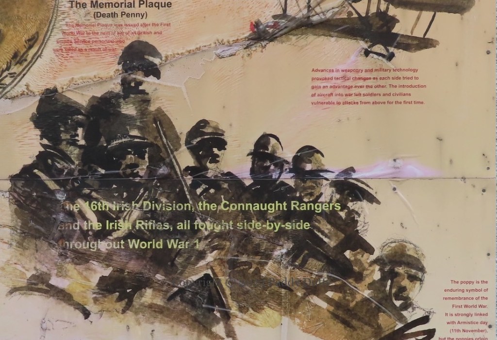 This board presents imagery and information about WWI, centrally including the statement (shown above) that “The 16th Irish Division, the Connaught Rangers [7th battalion] and the Irish Rifles [7th battalion], all fought side-by-side throughout World War I.”
