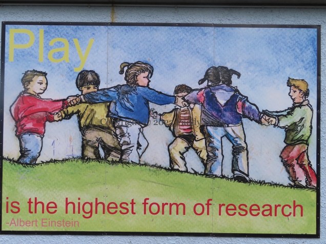 The second piece (mis-)attributes the quote “Play is the highest form of research” to Albert Einstein and shows children playing ring-a-ring-o’-roses. Painted by Ed Reynolds (steadyhanded.com).