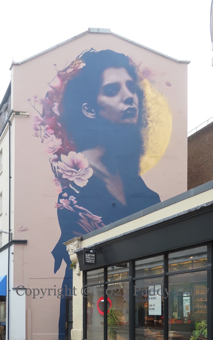 Work by emic (ig) in Castle Lane, Belfast, perhaps picking up a theme from Friz’s Under The Cherry Blossoms in Castle Arcade which focused on the castle and grounds in the era of Arthur Chichester. Chichester’s castle burned down in 1708 and by 1800 the castle and its grounds were vanishing under buildings akin to the nearby corn market and Belfast entries (WP).