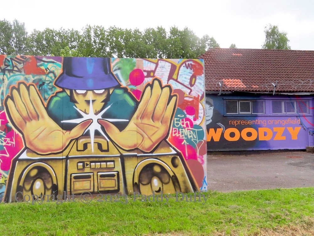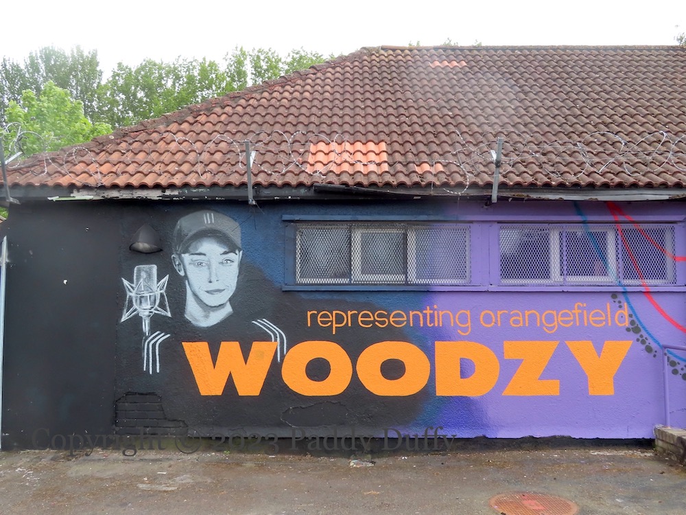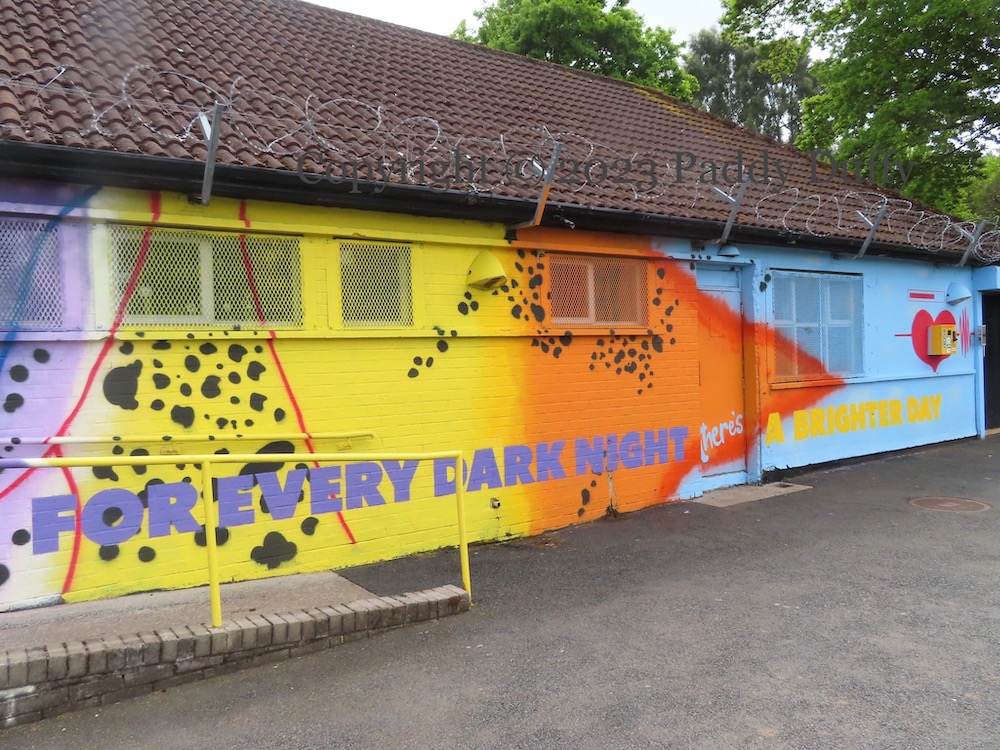 “For every dark night there’s a brighter day.” This mural on the pavilion in Orangefield Park encourages people –young men in particular – to take care of their mental health, and serves as a memorial to Adam “Woodzy” Woods, who died last (2022) May of an overdose (BBC). Skank FM has images of the launch (instagram). With assistance by 5th Element (ig).
