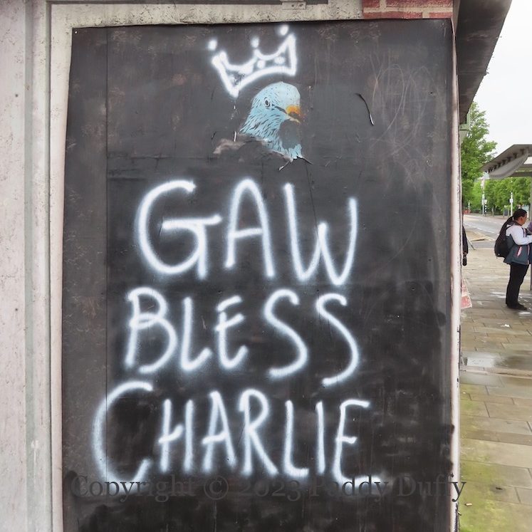 Gaw Bless Charlie 2023-05-202024-08-27Extramural Activity The pigeon gets a crown in imitation of the new UK monarch, Charles III. Graffiti by Hallion in east Belfast. Previously in this spot: Wear A Mask Or The Easter Bunny Gets It | Thran Rights Nai | Where’s Our 600 Quid? Click image to enlargeCopyright © 2023 Paddy DuffyT02768 Share this: Click to share on X (Opens in new window) X Click to share on Facebook (Opens in new window) Facebook Like Loading... Related