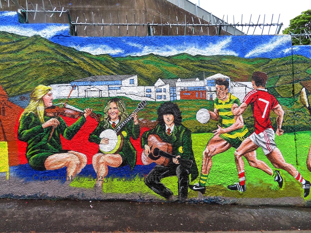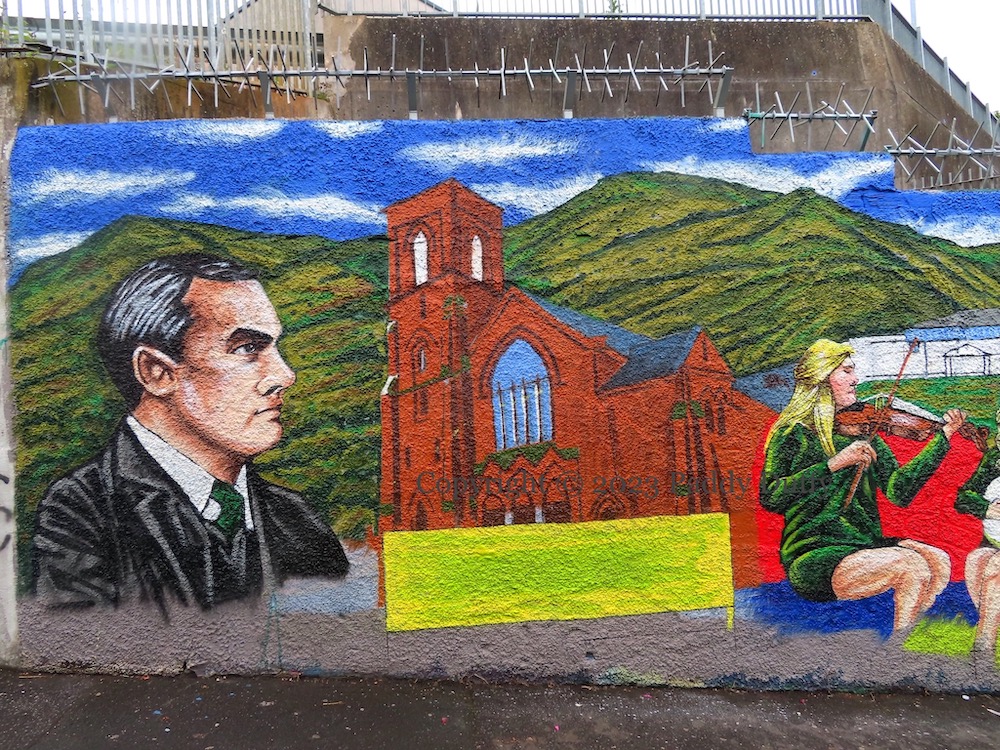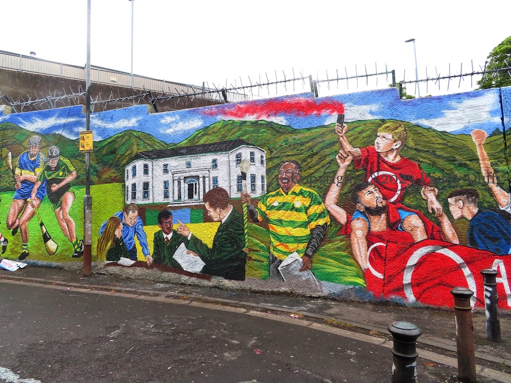 The theme of preserving and promoting the Irish language occurs in several places in the mural: next to Pearse we see his saying, “Máırtín Ó Chadháın ” [a land without a language [is] a land without a soul], in the classroom scene we have “Labhaır í agus maırfıdh sí” [speak it and it will endure], and finally we see the Dream Dearg protesting for an Irish-Language Act (see previously #AchtAnoıs).