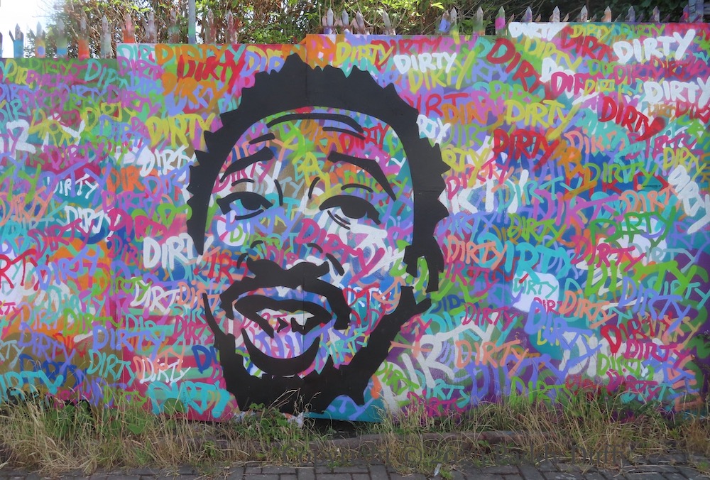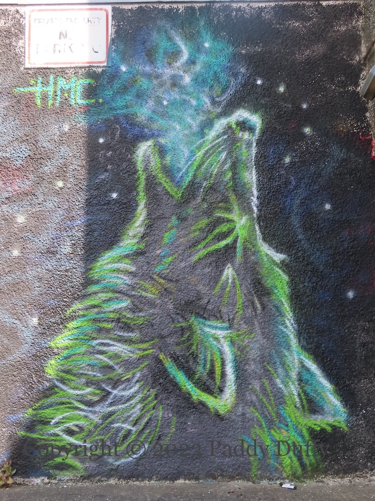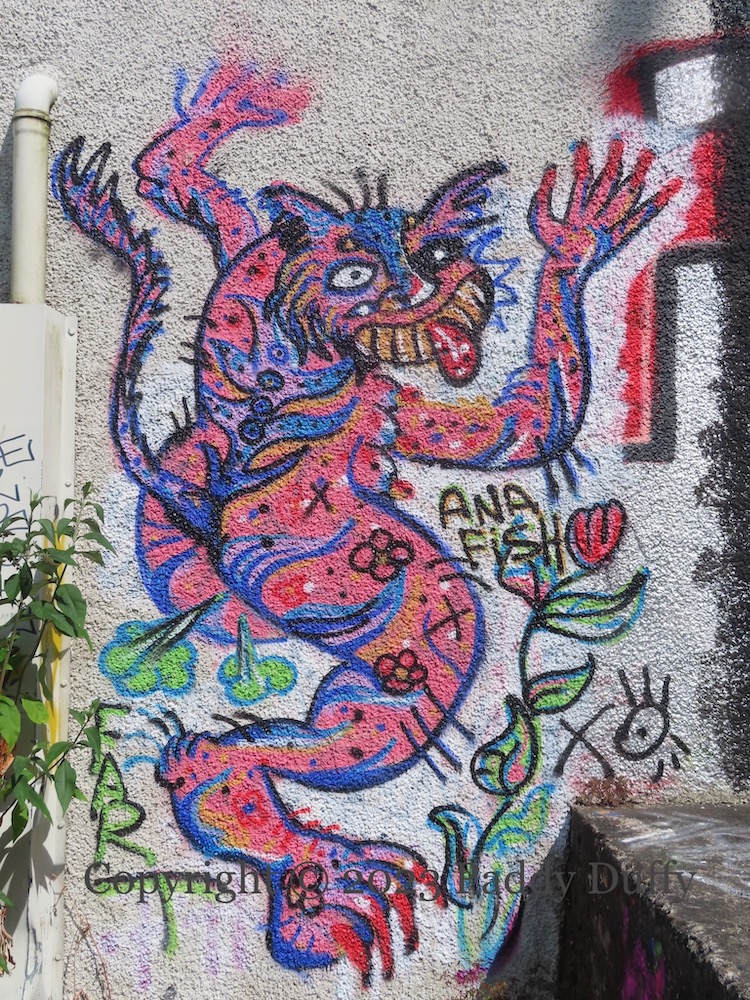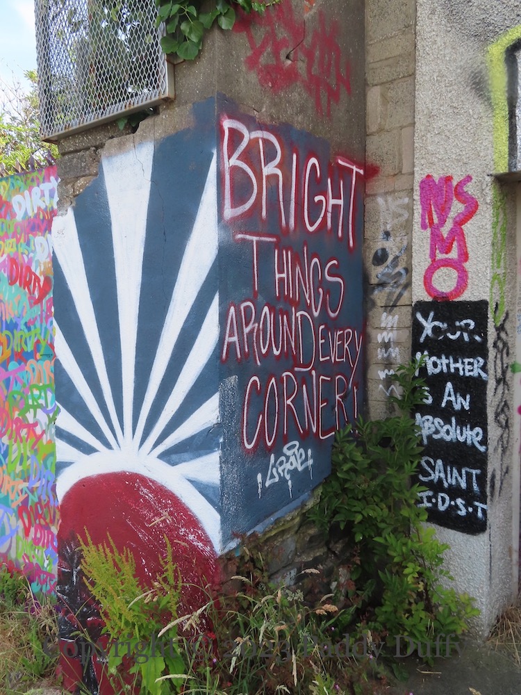 April additions to the green off Queen’s Parade, Bangor, by Aoife Laverty (@saul_art42), Chop Suey (ig), artist unknown “Bright things around every corner”, Ana Fish (ig), and HM Constance (ig) ‘No Barking’.