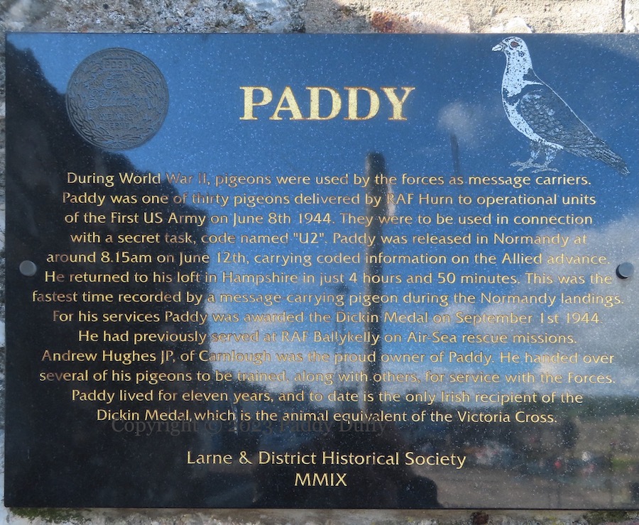 “During World War II, pigeons were used by the forces as message carriers. Paddy was one of thirty pigeons delivered by RAF Hurn to operational units of the First US Army on June 8th, 1944. They were to be used in connection with a secret task, code named “U2″. Paddy was released in Normandy at around 8.15am on June 12th, carrying coded information on the Allied advance. He returned to his loft in Hampshire in just 4 hours and 50 minutes. This was the fastest time recorded by a message-carrying pigeon during the Normandy landings. For his services Paddy was awarded the Dickin Medal on September 1st, 1944. He had previously served at RAF Ballykelly on Air Sea rescue missions. Andrew Hughes JP, of Carnlough, was the proud owner of Paddy. He handed over several of his pigeons to be trained, along with others for service with the Forces. Paddy lived for eleven years, and to date is the only Irish recipient of the Dickin Medal, which is the animal equivalent of the Victoria Cross. – Larne & District Historical Society MMIX.”