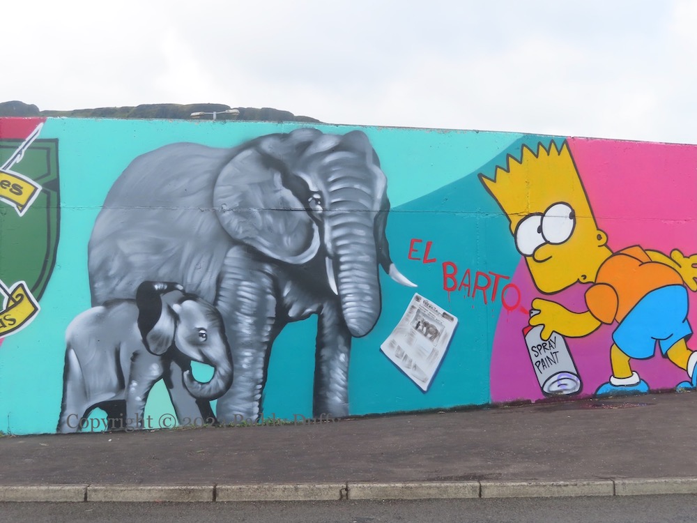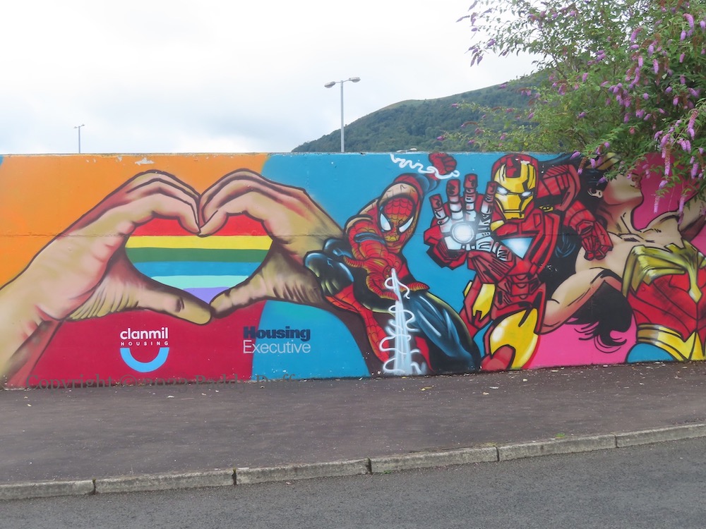 Here are six images showing the full expanse of the new mural at the entrance to Bawnmore. From left to right we see: a mill, a swan, a train (there used to be a station in Bawnmore), a guitarist, a farmer gathering hay, a hurler, Molly Seaton (who was captain of the Irish women’s soccer squad in a 1927 match played in Bond’s Field, in the Waterside – Derry Journal), Greencastle Rovers (Fb), Bawnmore Community, Wolfe Tone CLG (Fb), elephants from Belfast Zoo (a baby elephant called Shiela stayed in the Whitewell home of its keeper during the WWII Blitz – BelTel), El Barto (Bart Simpson), St Mary’s Star Of The Sea primary school (web), a hand-heart containing the rainbow colours, and superheroes Spiderman, Iron Man, and Wonder Woman. (NIHE)