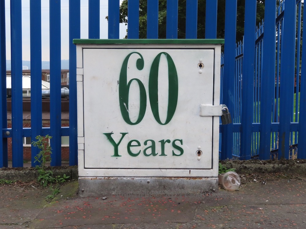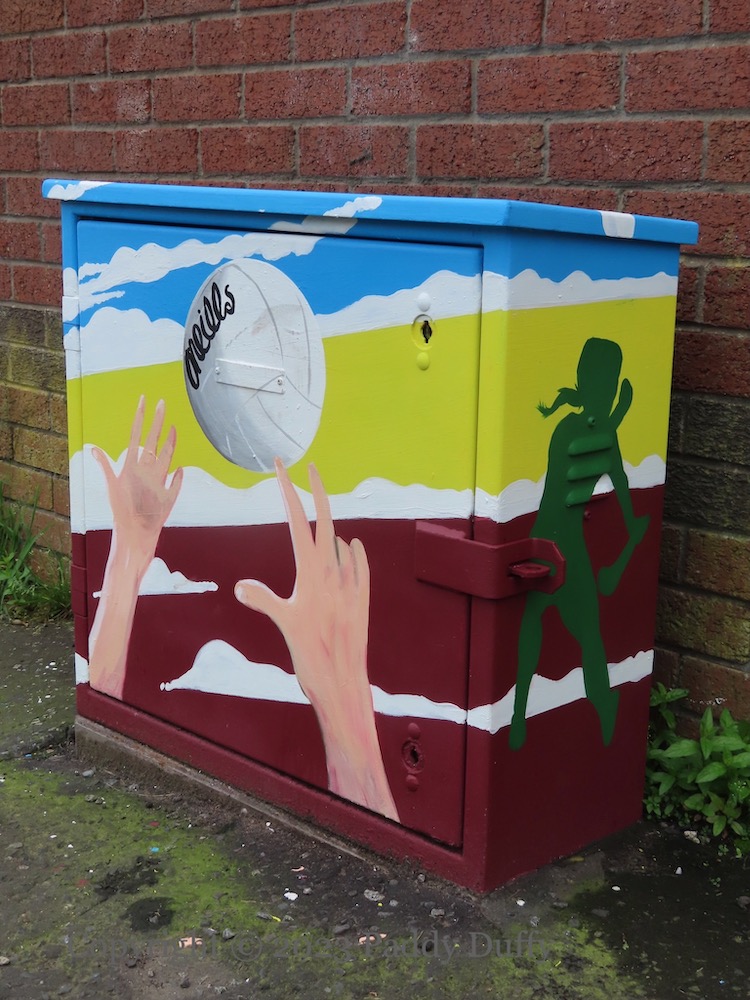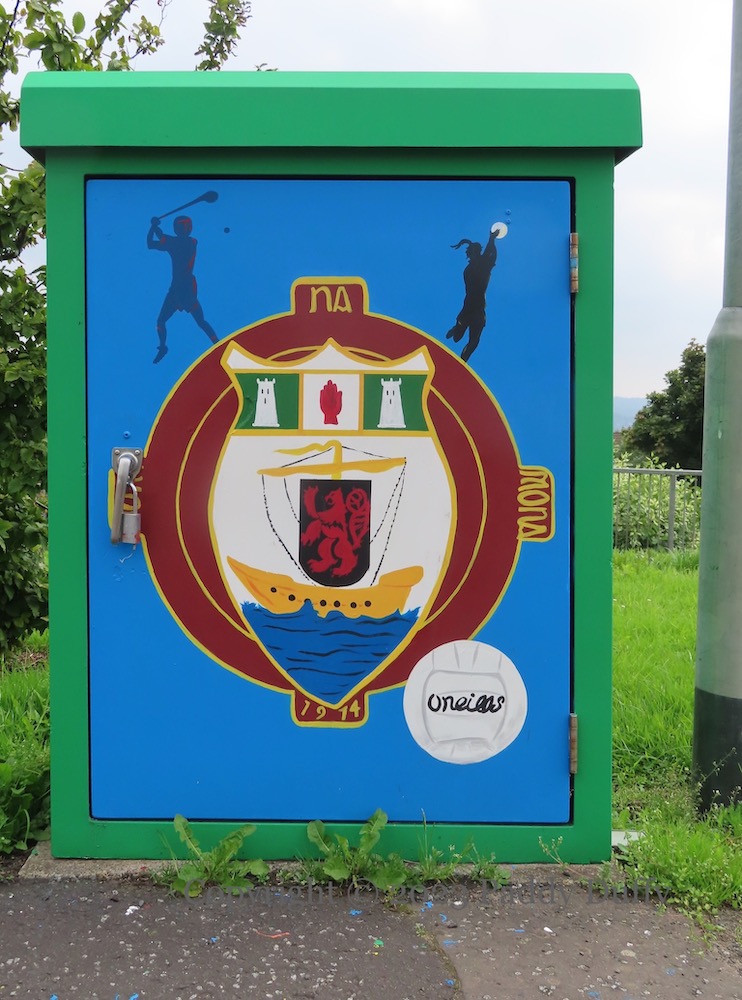 For the sixtieth anniversary, the electrical boxes outside John Paul II (formerly St Aidan’s) were stencilled (above and immediately below). This year (2023), more boxes have been painted, with images of gaelic games (see Gort Na Móna), bluebells (see Féıle Na gCloıgíní Gorma), and the silver fáınne on red background (see #AchtAnoıs).