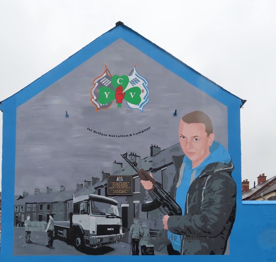 The line in the poem “the resistance formed a steady band” is unclear – it might refer to loyalists being bussed into Torrens in 1996 (see the testimonies in Jarman); if it refers to B Company it would make a connection to Rockett. As it is, the connection between the two elements of the mural (if any is intended) seems to be that Rockett was from the lower Oldpark, near Torrens.