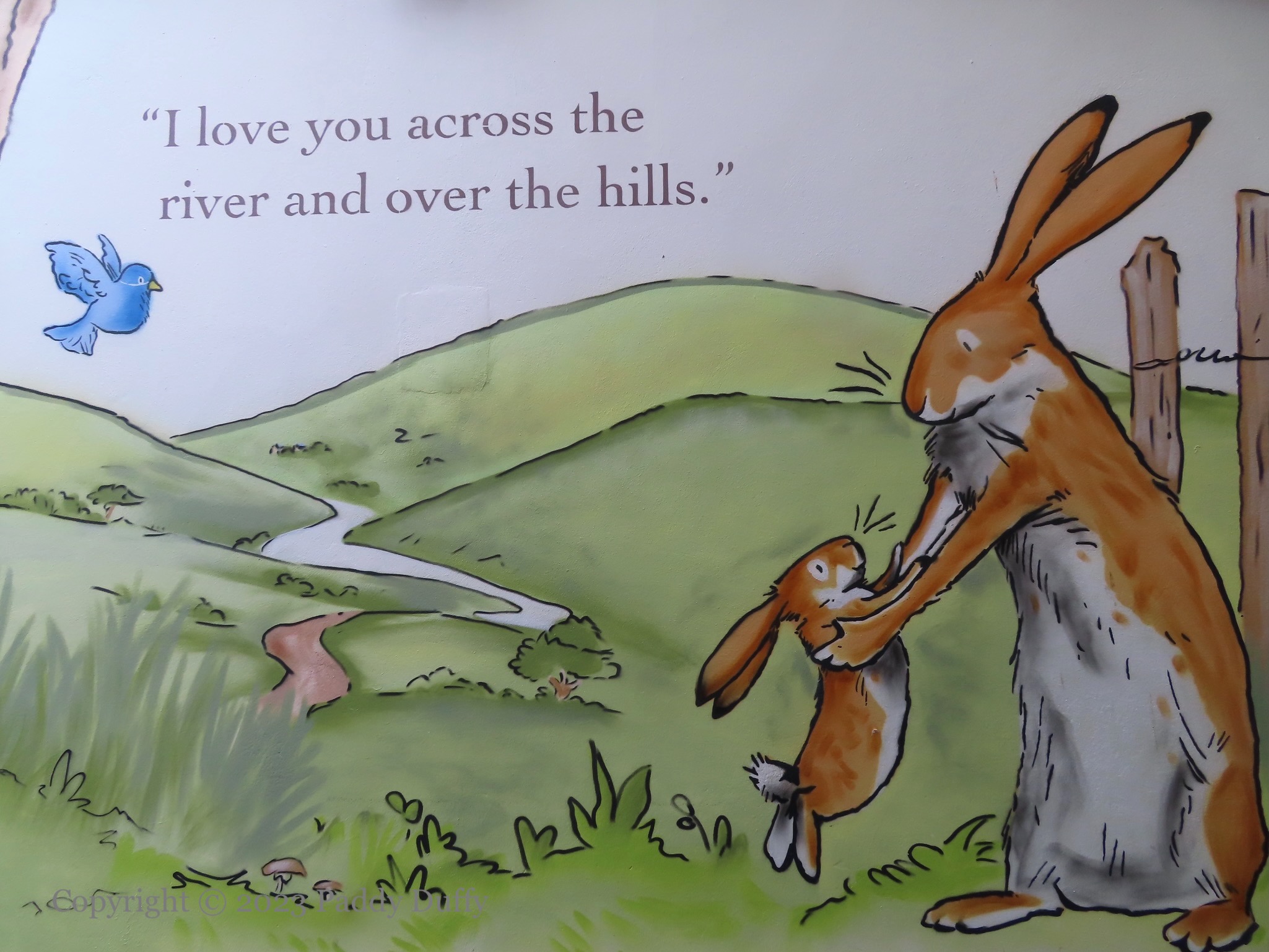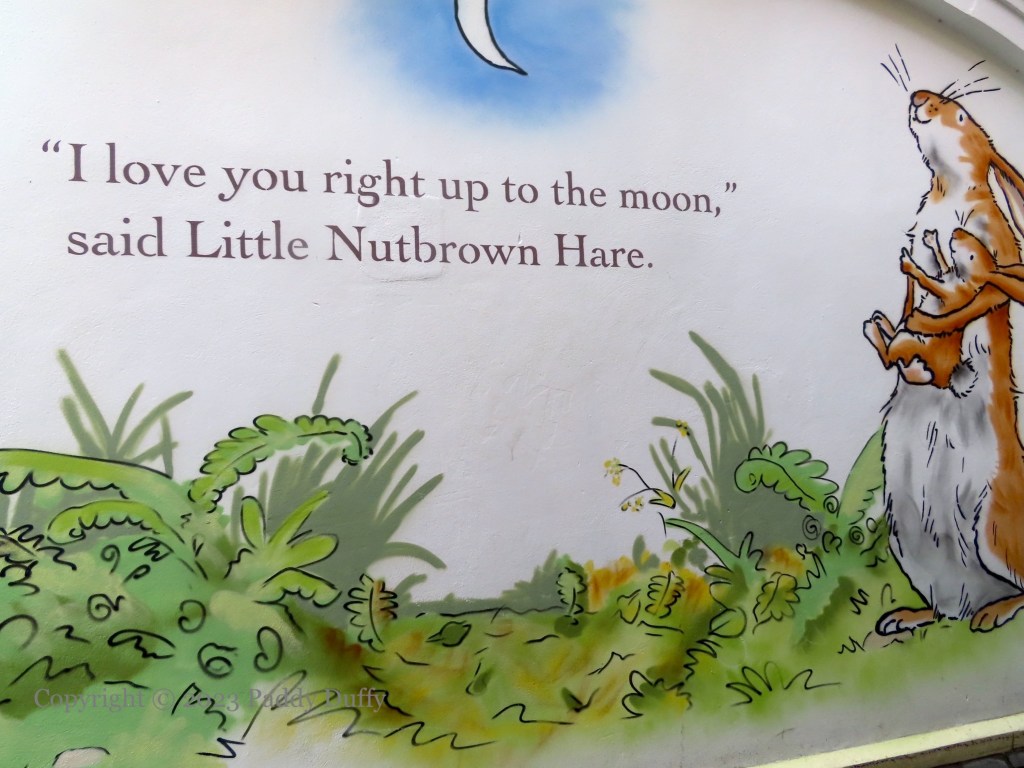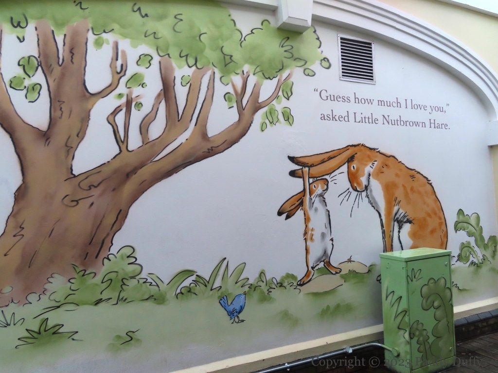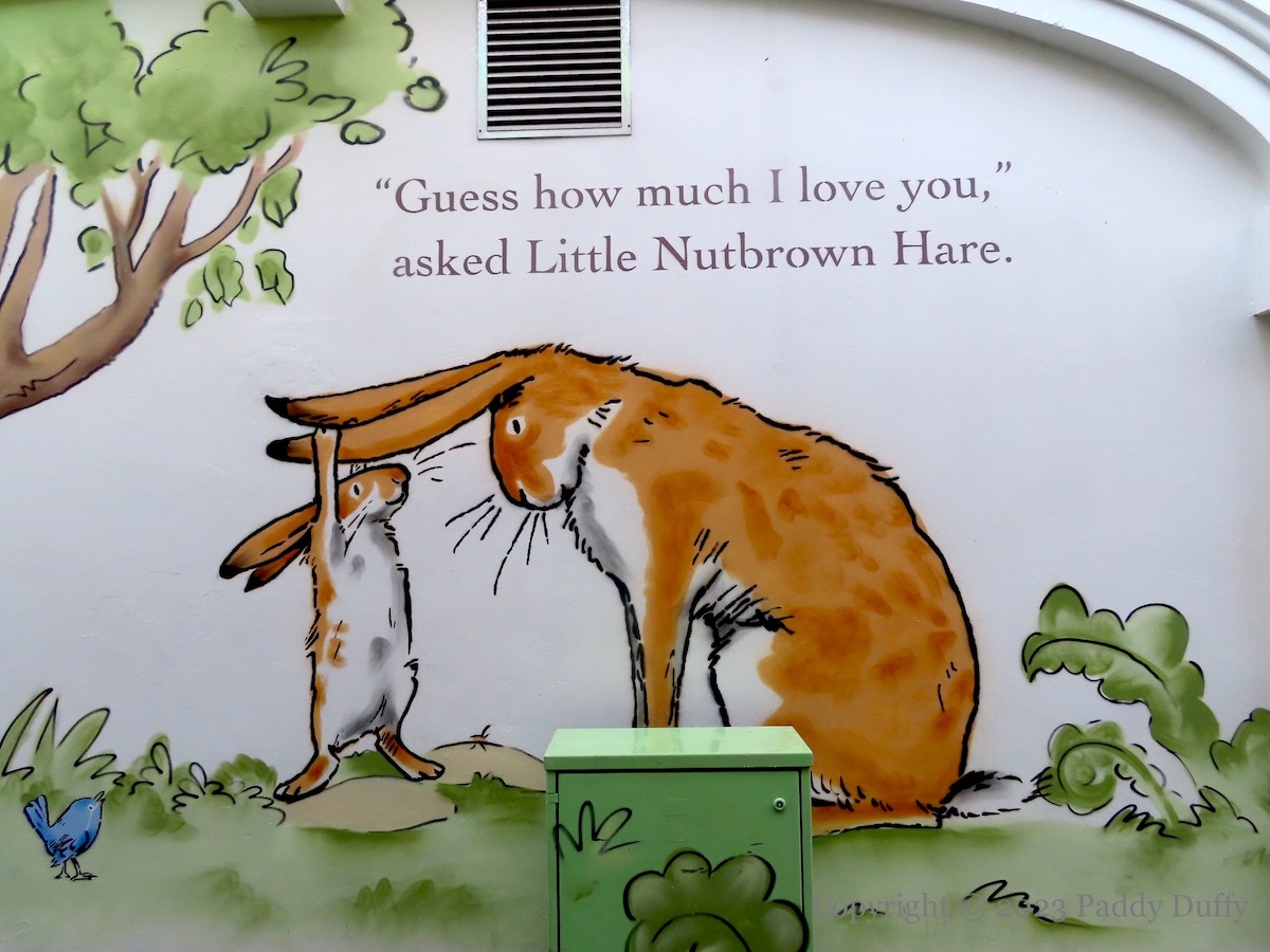 Little Nutbrown Hare and Big Nutbrown Hare use the landscape and the limits of their attributes to express how much they love each other. Parts of Sam McBratney and Anita Jeram’s book are made large for the walls of Haslem’s Lane in McBratney’s home town of Lisburn. The murals were painted by Visual Waste (ig) as part of a new public art trail from Lisburn CC.
