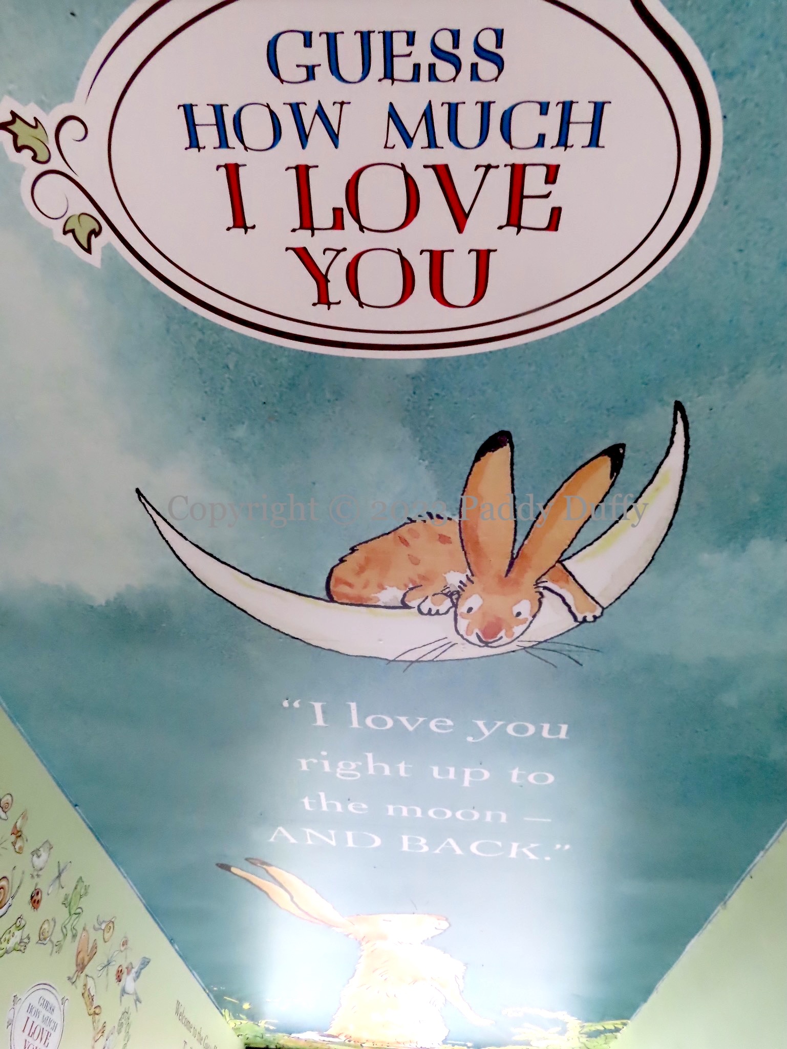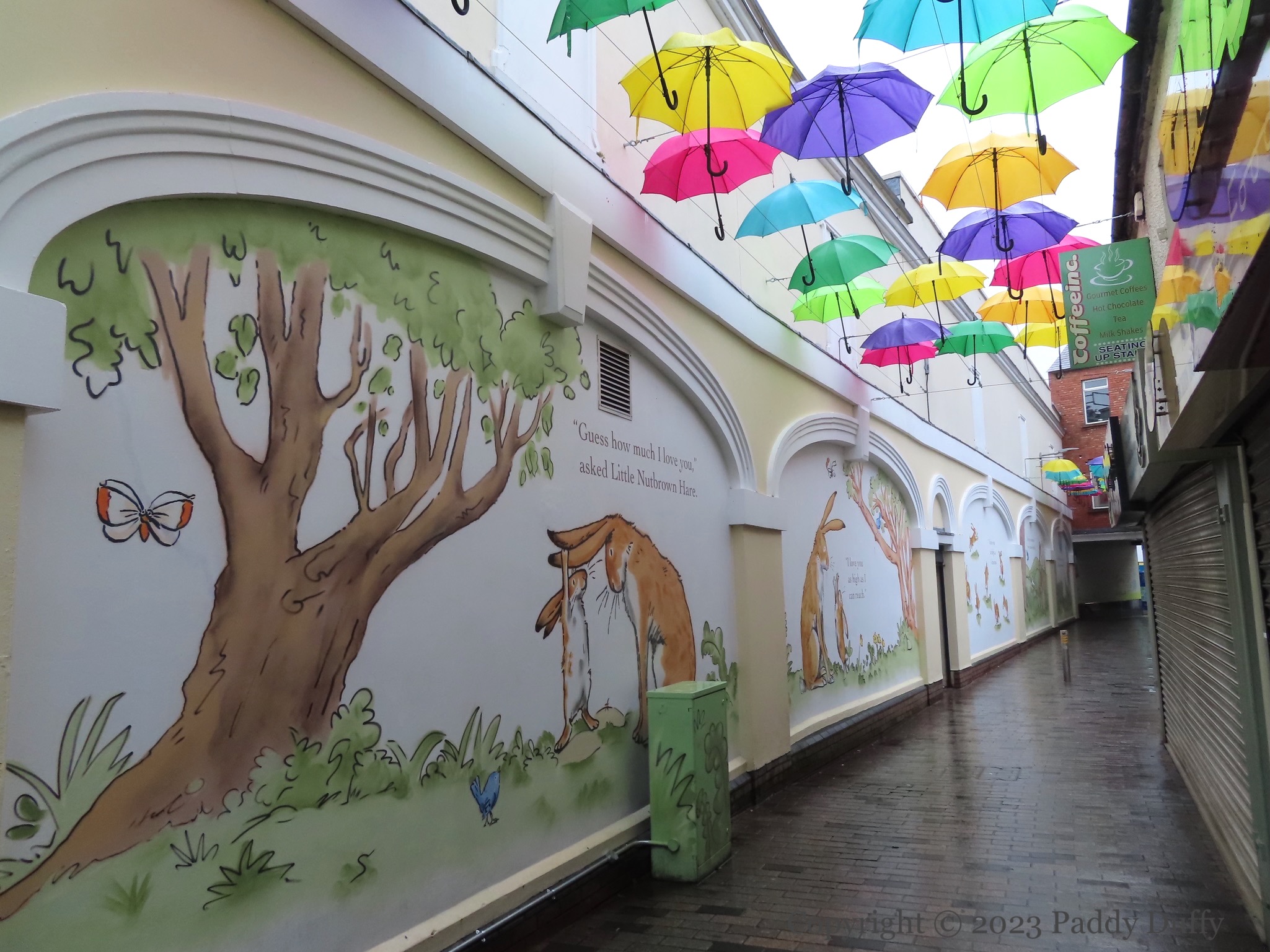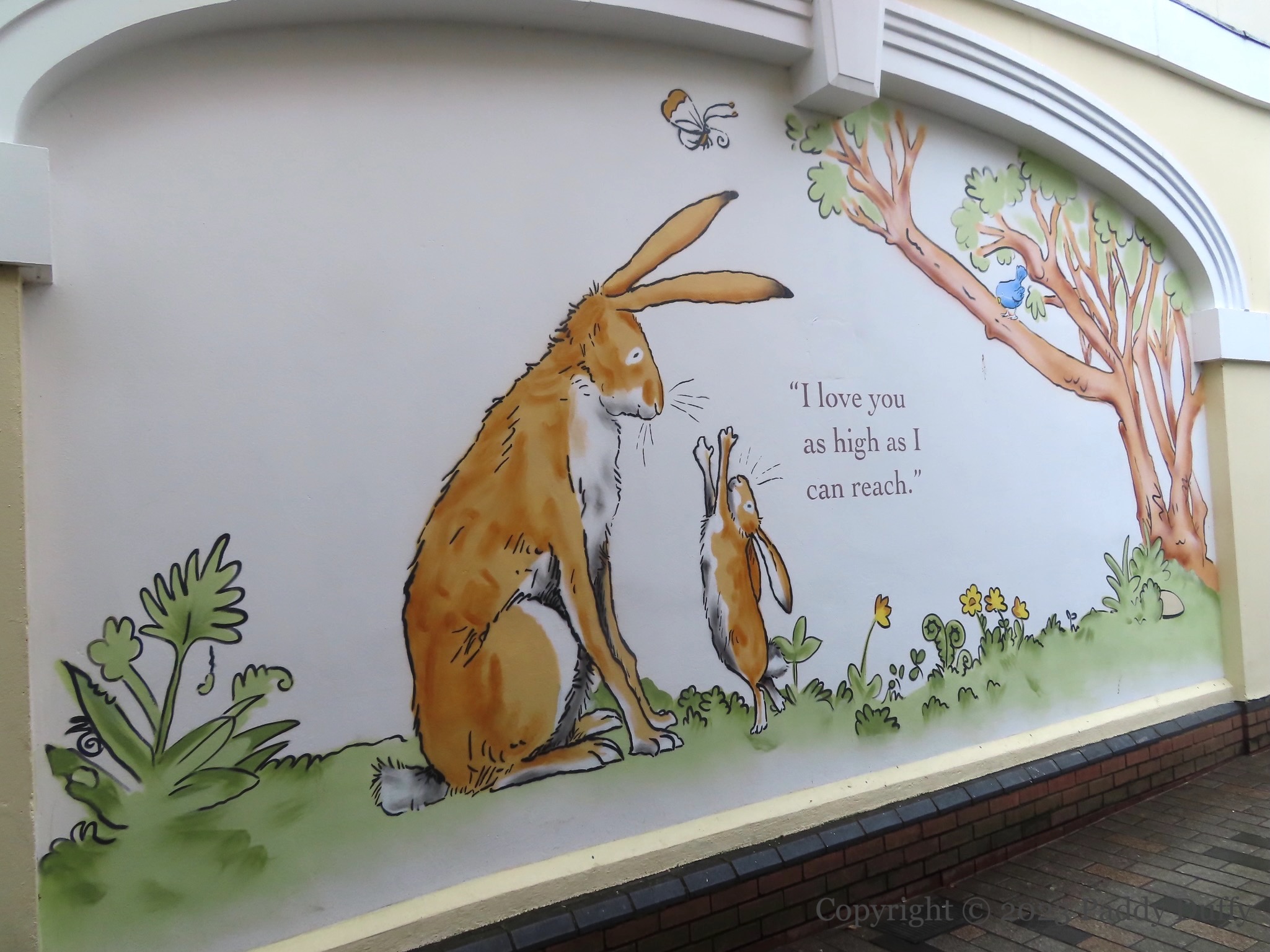 Little Nutbrown Hare and Big Nutbrown Hare use the landscape and the limits of their attributes to express how much they love each other. Parts of Sam McBratney and Anita Jeram’s book are made large for the walls of Haslem’s Lane in McBratney’s home town of Lisburn. The murals were painted by Visual Waste (ig) as part of a new public art trail from Lisburn CC.
