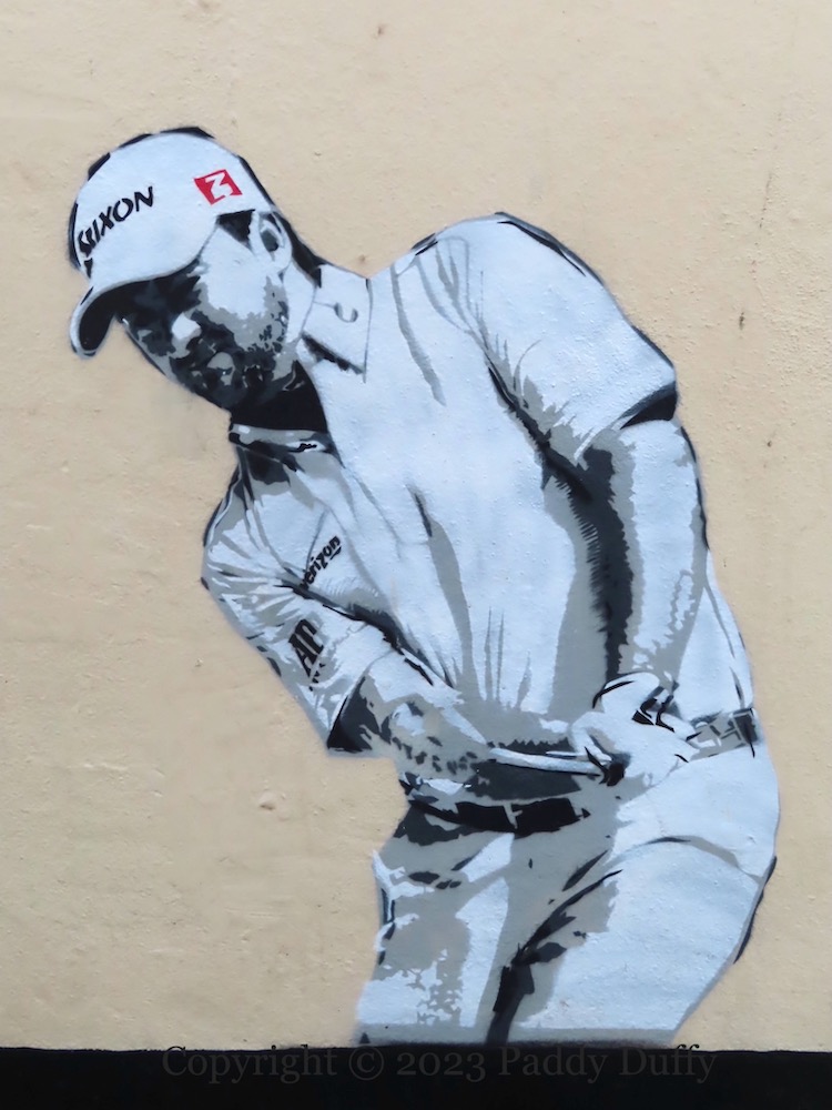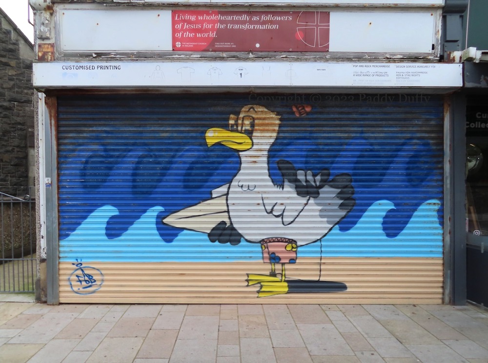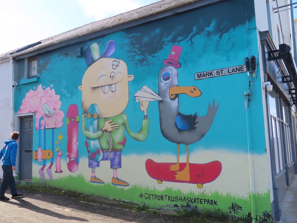 Here is a small gallery of Portrush street art. From top to bottom, the pieces are by surfer by Aches (ig), Graeme McDowell by an unknown stencil artist (perhaps for the 2019 Open golf Irish News) on the side of the Springhill Bar, a surfing seagull in Eglinton St by FGB (ig), ‘Get Portrush a skate park’ and ‘Largey’s Lane’ by KVLR (ig) in Mark St Ln.