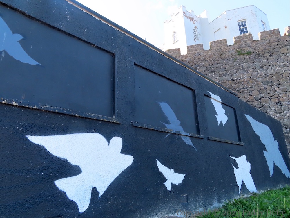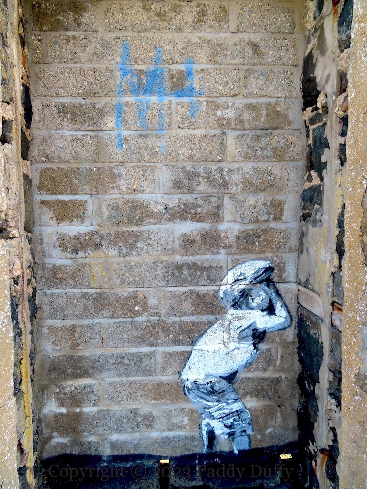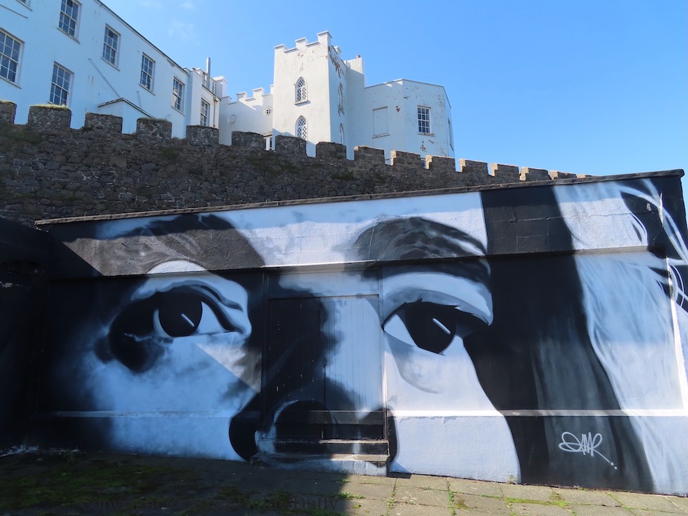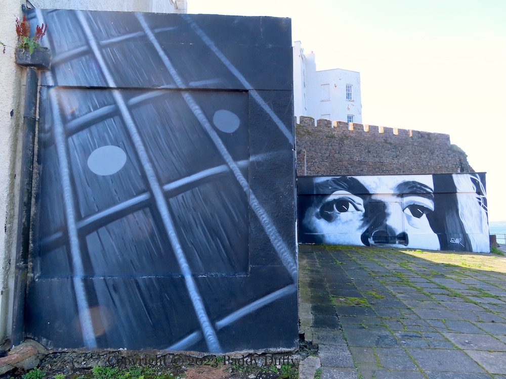 Here is a small collection of street art from Portstewart. Above, is Dan Leo’s osprey in Strand Road. Below, a boy playing hide-and-seek by an unknown stencil artist; and finally, a number of images of JMK’s ‘A Tribute To Henry’ on The Crescent — “Henry” denotes Henry McCullough, Portstewart native and guitarist for Joe Cocker and Wings, who died in 2016 (WP).