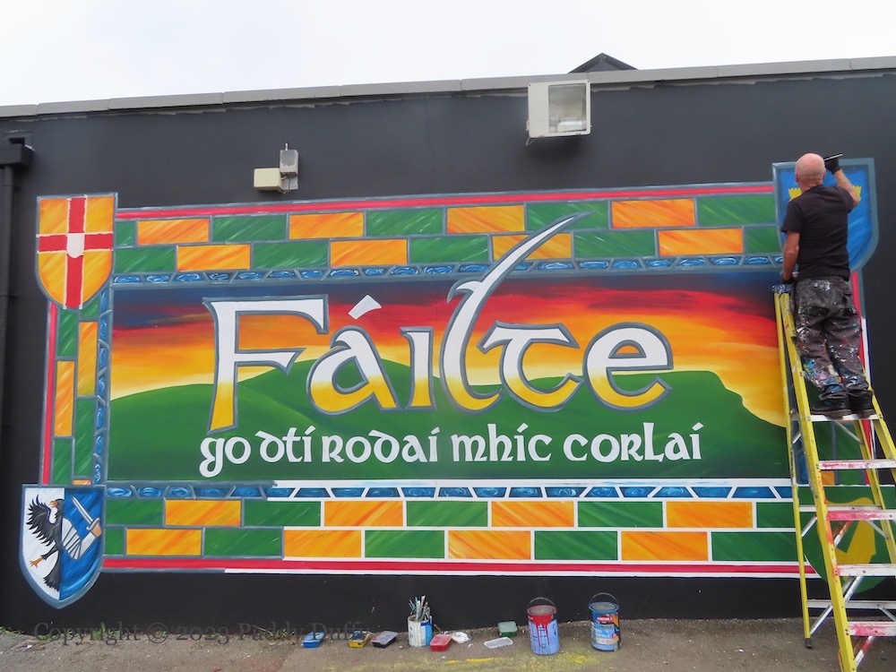 A new “fáılte” [“welcome”] mural was painted at the Roddy’s in anticipation of the official opening of the new republican heritage centre/ıonad oıdhreachta poblachtaí (web) which took place on September 28th. Construction of the museum and the adjacent restaurant began in May 2021 with an investment of 1.35 million pounds (Belfast Live). The museum’s exhibits cover republican history from 1798 to the present, and items on display from the Society’s collection include vintage uniforms and artefacts, historic maps and documents, and prison handicrafts.