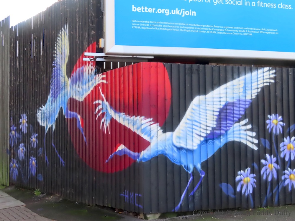 See previously: the crane as a symbol of peace on the Cupar Way “peace” line: Tsuru.