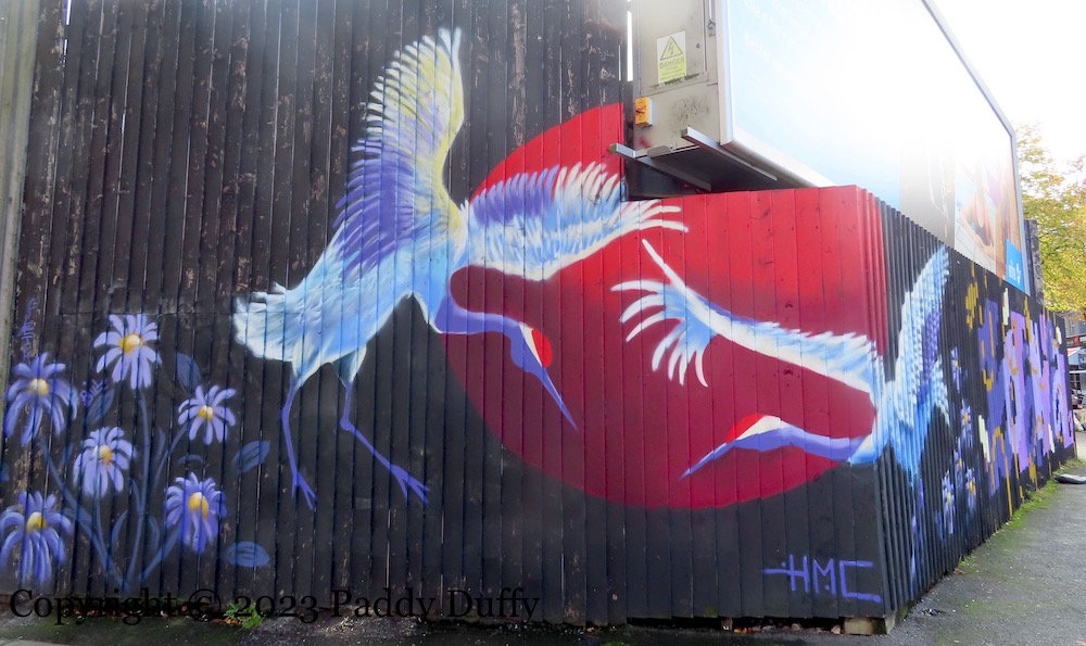 In Japanese mythology, cranes are symbols of longevity because they are reputed to live for a thousand years (KZN). These cranes, however, were painted on September 24th by HM Constance (ig) and Zippy (ig) at the junction of Donegall Pass and Botanic Ave for the Open Botanic festival, and they were still in place on October 1st when the first two photos shown here were taken, but by October 4th the front fencing (on the Botanic Avenue side) had been painted over, taking out the crane on the right.