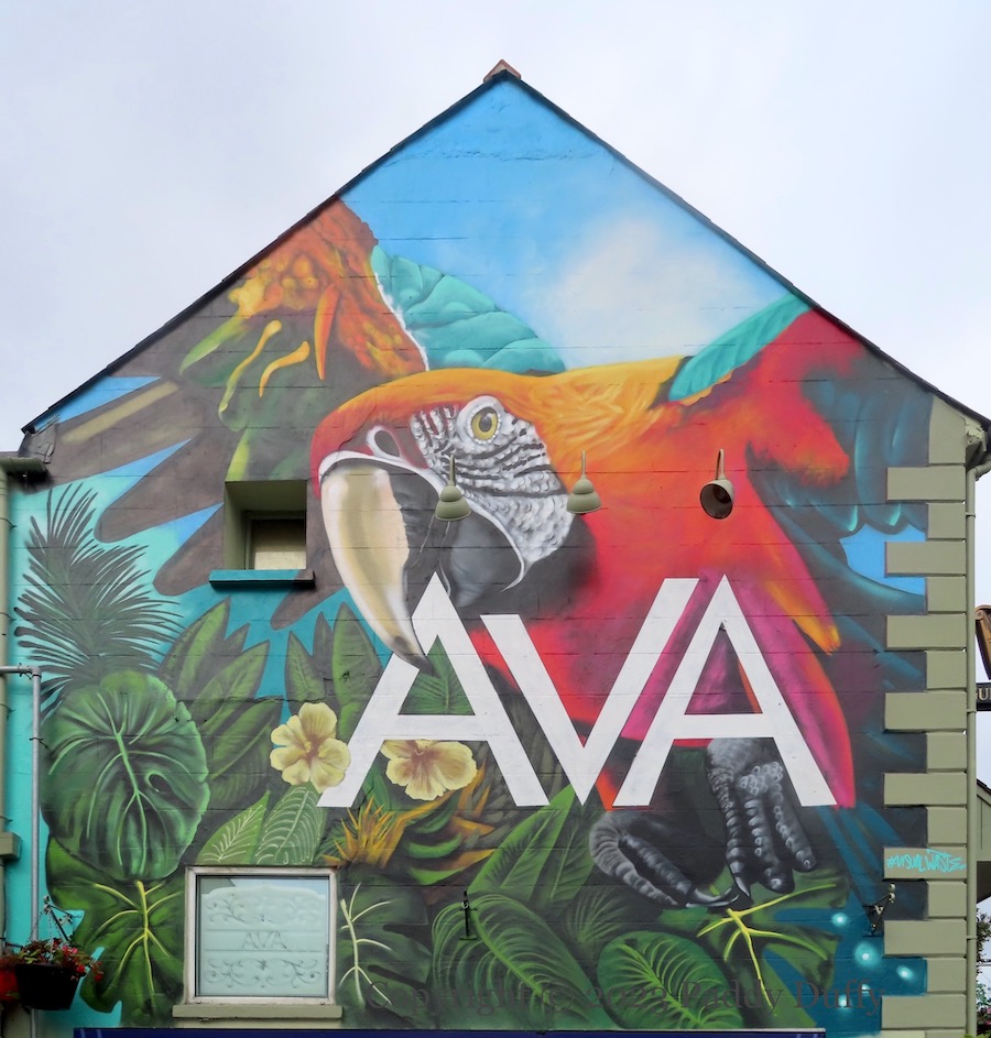 This large parrot was painted by artist Visual Waste (ig) on the side-wall of the Ava wine-bar in Bangor to match the theme of its cocktail lounge.