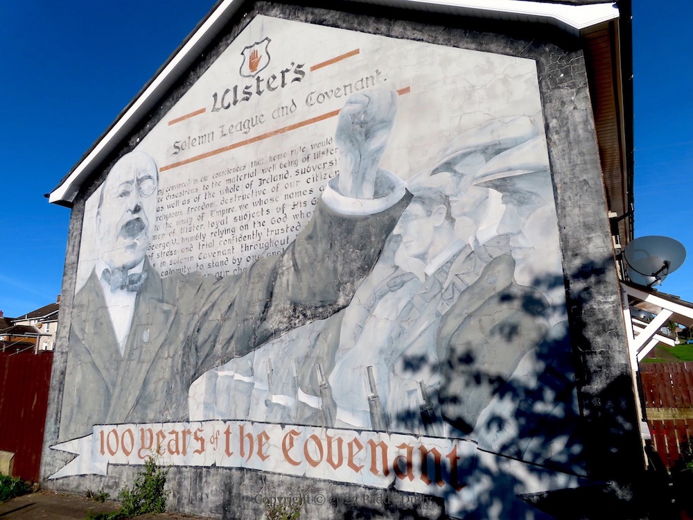 The mural above uses the text of the Ulster Covenant, signed in September, 1912, as a backdrop to a composite of two photographs from 1914, showing Edward Carson speaking and a row of Ulster Volunteers, which were formed in January 1913.