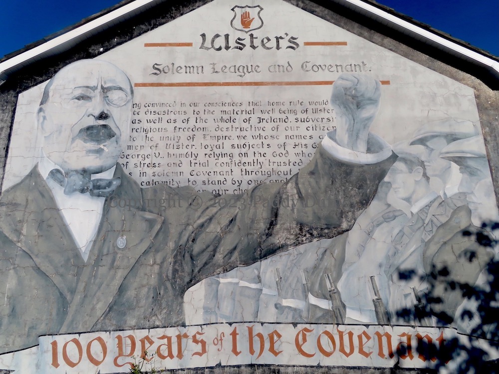 The mural above uses the text of the Ulster Covenant, signed in September, 1912, as a backdrop to a composite of two photographs from 1914, showing Edward Carson speaking and a row of Ulster Volunteers, which were formed in January 1913.
