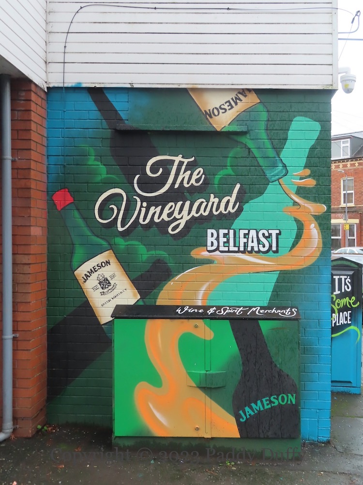 It’s The Spirit We Share 2023-10-202026-02-05Extramural Activity This piece for Jameson whiskey is on the side-wall of the Vineyard off-license (web) off the Ormeau Road and is by Alana McDowell (ig). Click image to enlargeCopyright © 2023 Paddy Duffy[T03544] T03545 T03546 T03547 Share this: Share on X (Opens in new window) X Share on Facebook (Opens in new window) Facebook Like Loading... Related