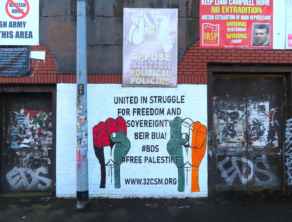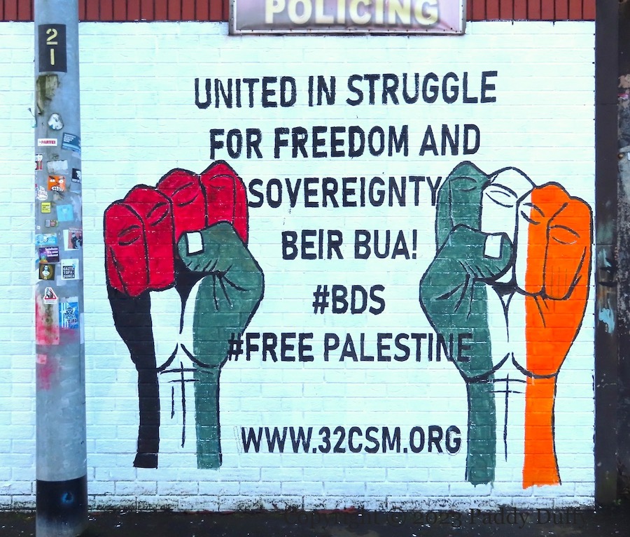 “United in struggle for freedom and sovereignty. Beir bua! #BDS #FreePalestine. www.32csm.org” — Palestinian and Irish fists raised together in solidarity.