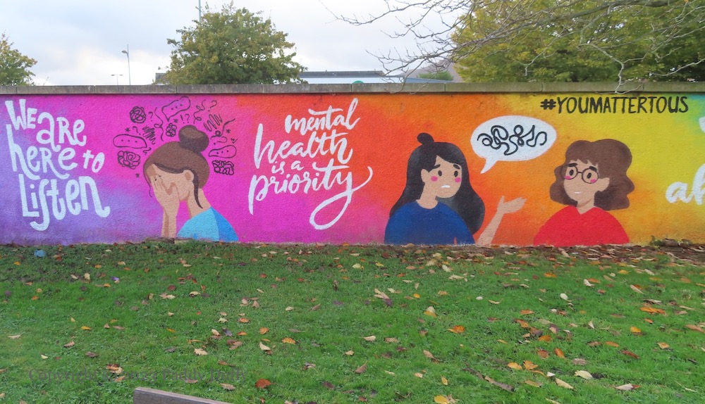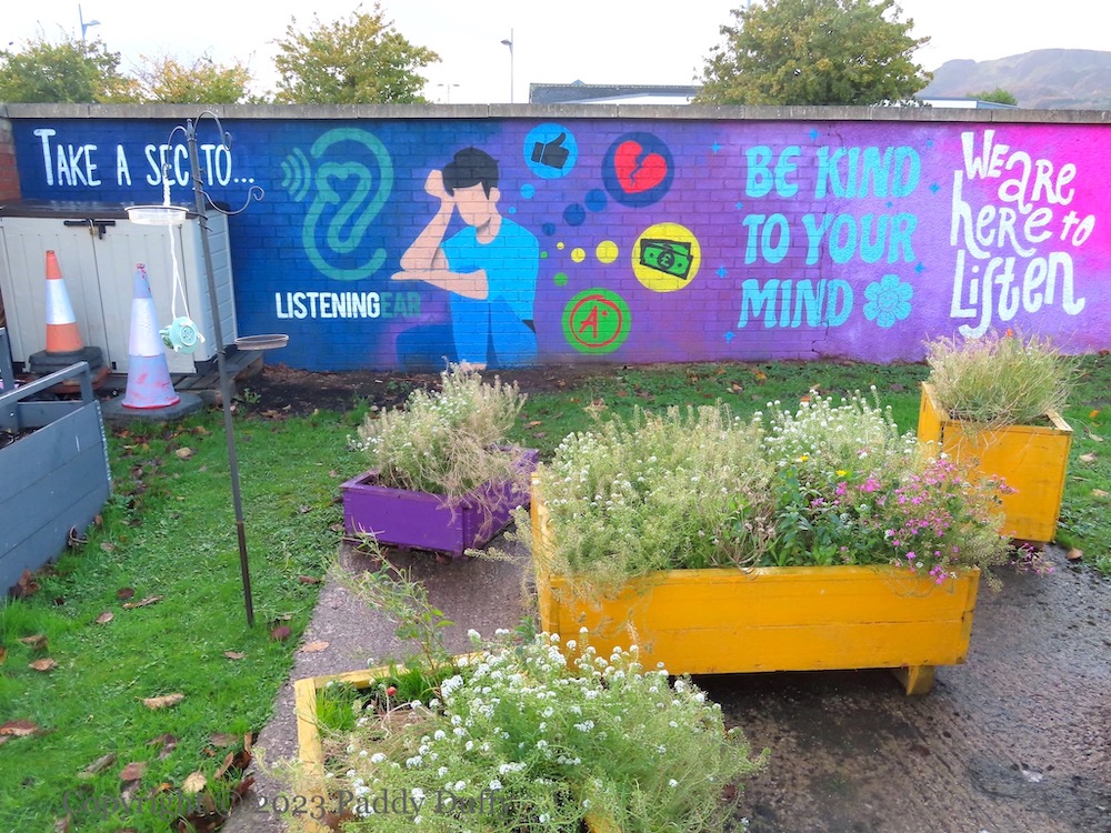 The new ‘Listening Ear’ murals on the interior garden wall of the Dunanney Centre, Rathcoole, were launched at the start of November by David Healy and Roy McGivern of Linfield FC (Fb). The mental-health messages – “be kind to your mind”, “we are here to listen”, “mental health is a priority”, “#youmattertous” – join the existing ‘community garden’ mural (above) and there’s also a panel of blackboard paint for kids to write and draw on.