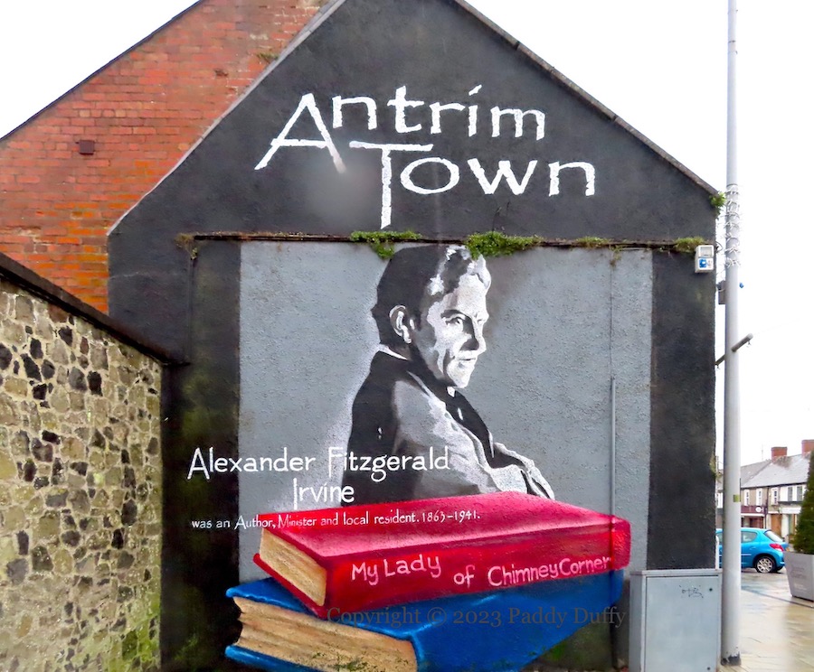 “Alexander Fitzgerald Irvine was an Author, Minister and local resident [of “Antrim Town”] 1863-1941.” The family home where he was raised was in Pogue’s Entry, now a museum and site of the blue plaque, below, outside which sits the mural above (paid for by Lidl) (Antrim Guardian). (ITV video of the house from 1960 and 1963.)