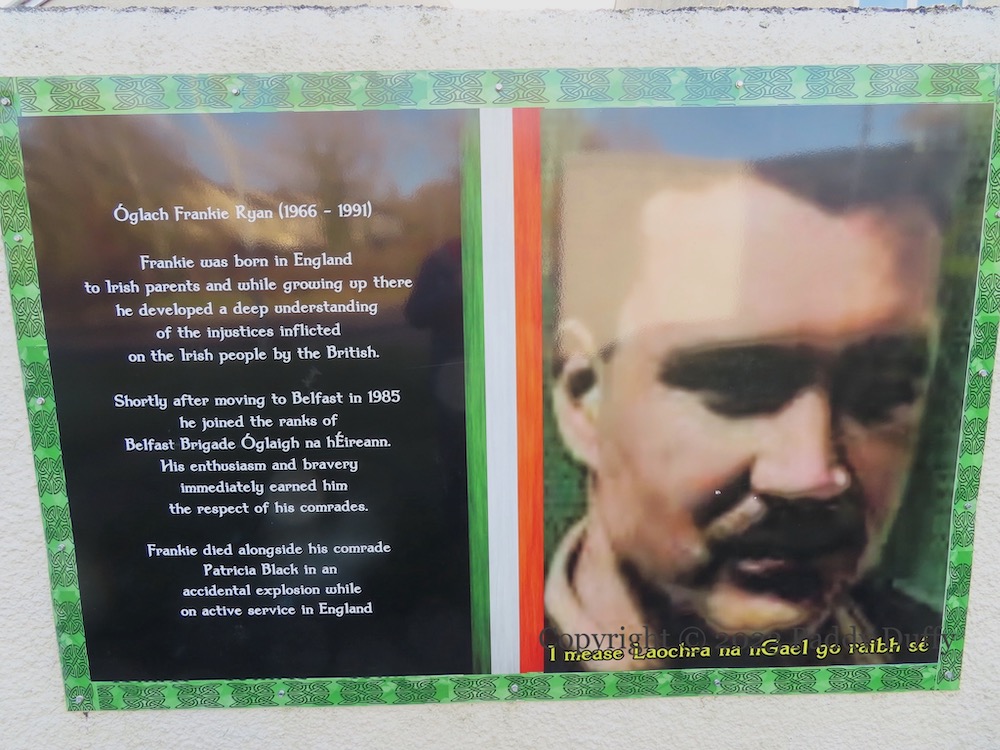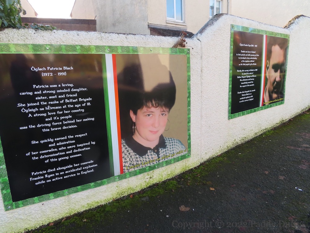 “I measc laochra na nGael go raıbh sıad.” Profiles of Patricia Black, Frankie Ryan, Michael Ferguson, and Sean Keenan were added in late 2021 (video of launch) to the pair of existing monuments that memorialise them in Colin/Poleglass (for which see The Undauntable Thought on Peter’s site).