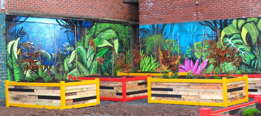 There are now nine planters and ten bird boxes, with a backdrop of tropical plants and birds, at the junction of Downshire Place and Great Victoria Street (Linen Quarter BID).
