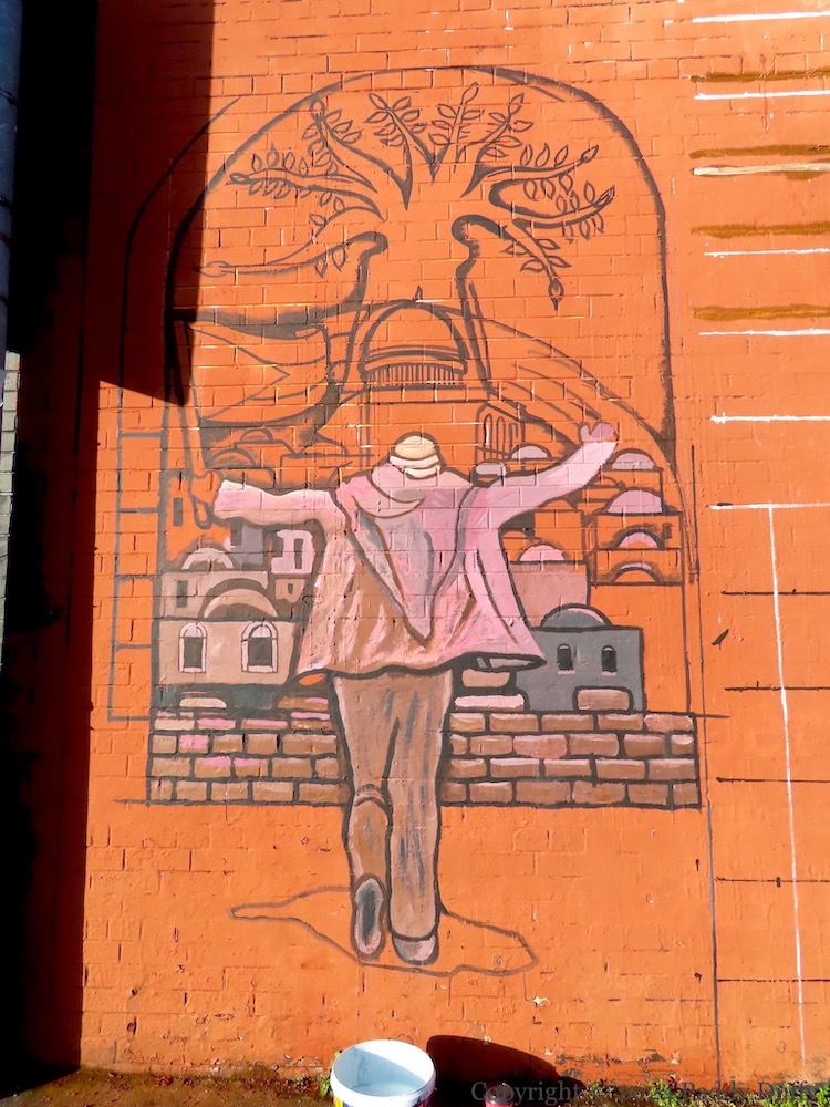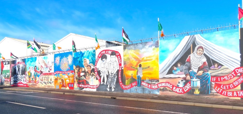 The Land Is Ours – Divis St, BelfastKhan Younis mass grave – Divis St, BelfastBethlehem holiday fireworks – Divis St, BelfastAshour children + phoenix – Divis St, Belfast