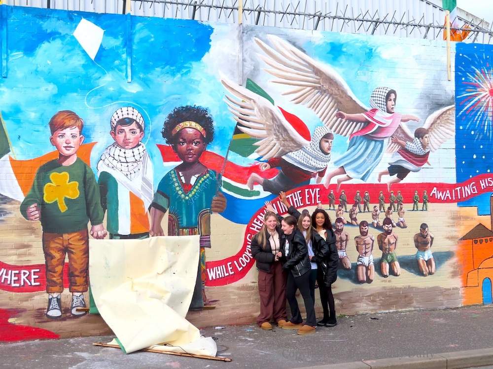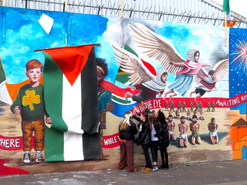 soldiers – Divis St, BelfastA Window To A Free Country – Divis St, Belfastthree children – Divis St, Belfastthree children / children flying over prisoners – Divis St, Belfastfamily – Divis St, Belfastphoenix – Divis St, BelfastPainting For Palestine wide left – Divis St, BelfastPainting For Palestine wide right – Divis St, Belfast