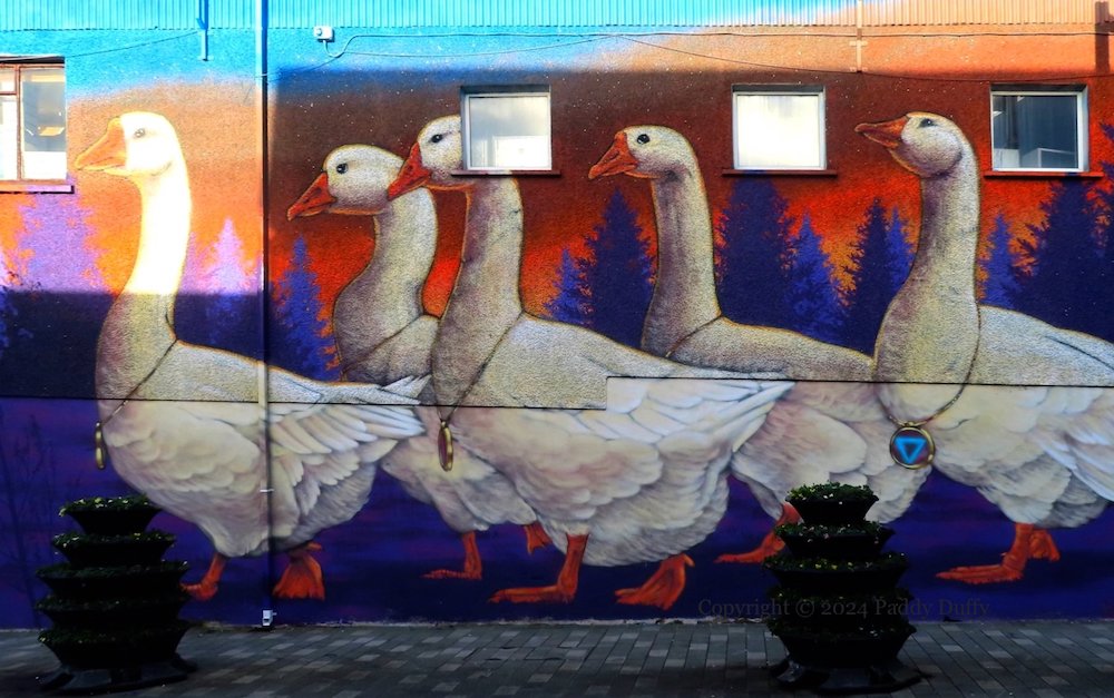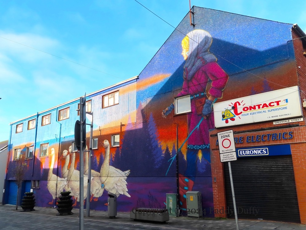 The Saturday market in Ballymena goes back to the 1600s but has had troubles recently finding a thriving home (Ballymena Guardian). The recent streetart by Friz (ig) and NRMN (ig) in Greenvale Street is intended to be a reference to the ancient market and is (probably) inspired by James Guthrie’s 1883 painting, ‘To Pastures New’, showing a girl herding geese in Lincolnshire.