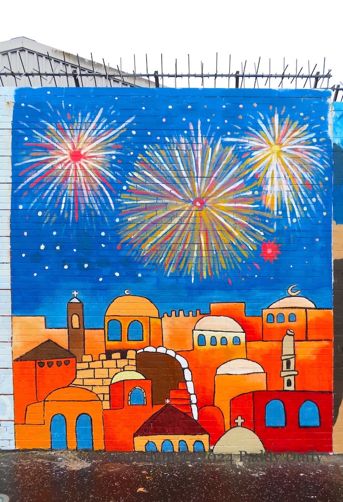 Heba Zagout (ig) was a Palestinian artist and teacher who painted Palestinian women and scenes from everyday life, including one from 2022 of holiday fireworks over a Bethlehem skyline that includes both churches and mosques. (You can see the original acrylic on the Painting For Palestine facebook page). The painting has now been reproduced as a mural on the International Wall in CNR west Belfast. She and two of her children, Adam and Mahmoud, were killed in October in an Israeli air strike on Gaza. (Middle East Eye | Guardian)