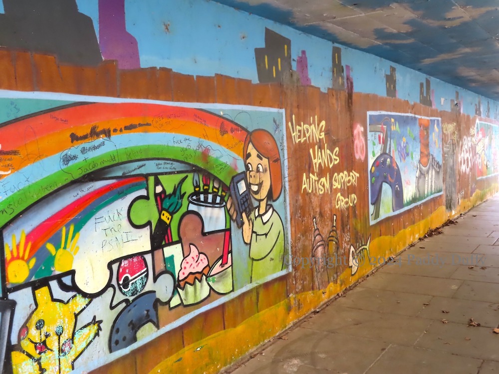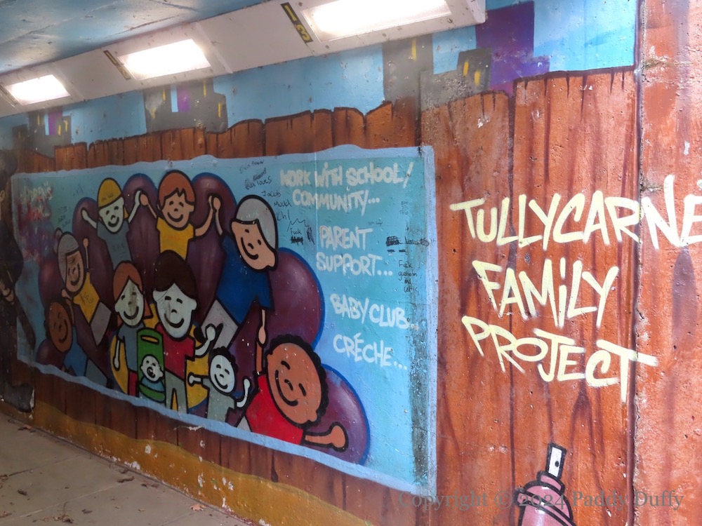 Here is a gallery of images from the Blaze FX art in the (western) Tullycarnet subway, which promotes various community organisations, including TagIt (Fb), Tullycarnet flute band (Fb), Tullycarnet Community Football Club, Tullycarnet Family Project, Helping Hands Autism Support Group.