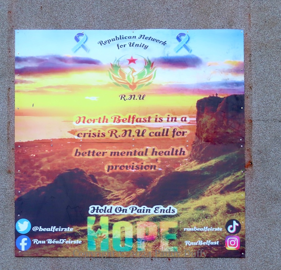 “North Belfast is in a crisis. RNU [Republican Network For Unity (Fb | ig)] calls for better mental health provision. Hold on, pain ends. Hope.”