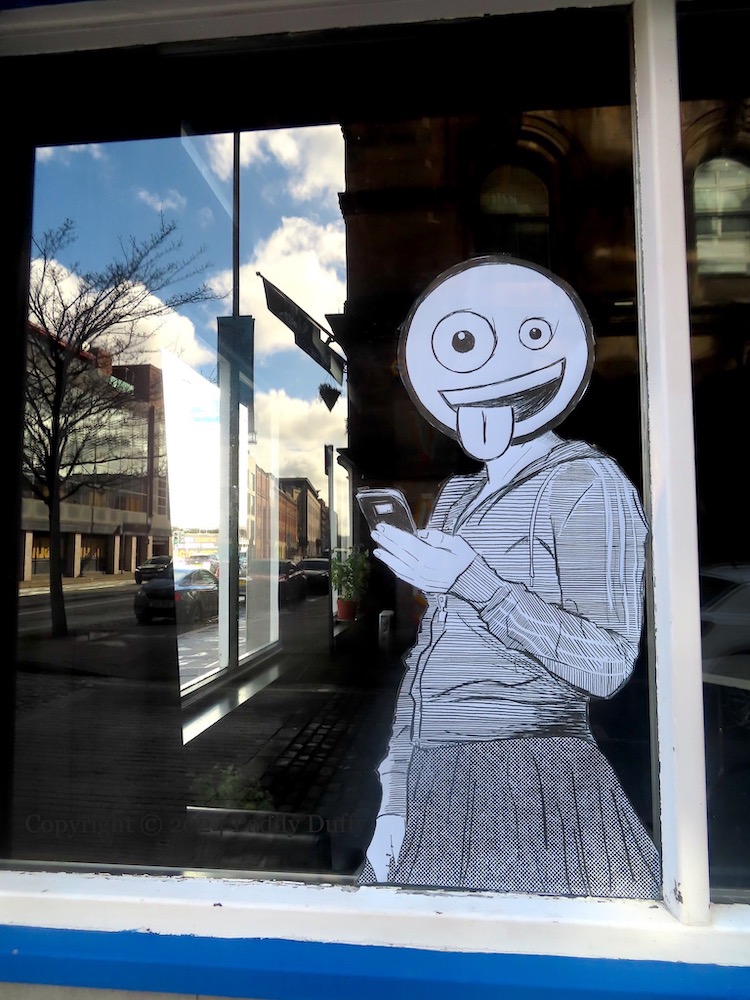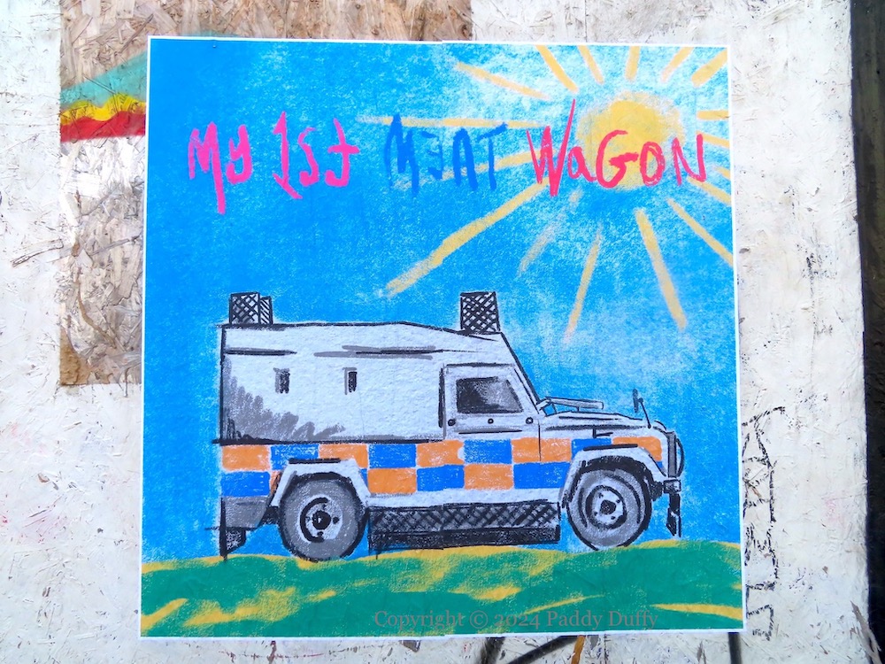 Here are two paste-ups by Leo Boyd (web) in Belfast city centre. The PSNI land-rover is a familiar subject – see Off The Ledge in the Seosamh Mac Coılle collection for a list.